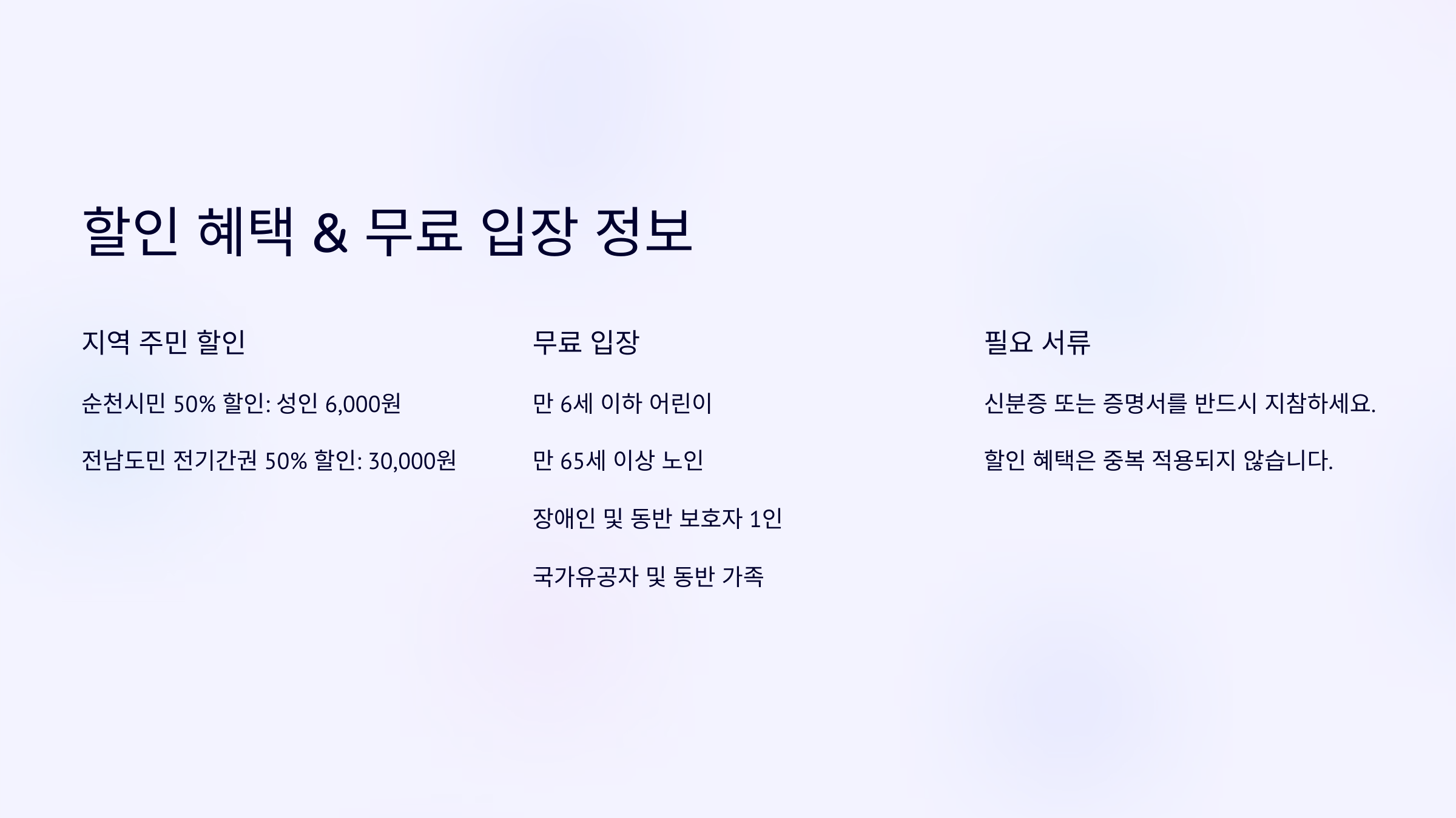 - ✅ 할인 혜택 놓치지 않기! 순천 시민 할인, 경로우대, 장애인 할인, 단체 할인 등 다양한 혜택을 꼭 확인하세요.