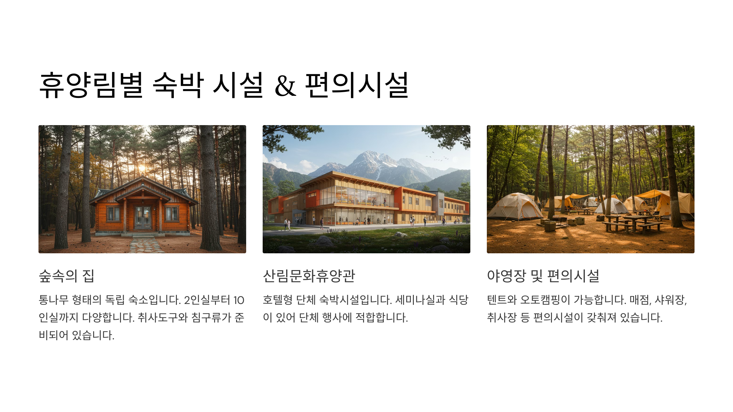 - 🚻 화장실: 모든 휴양림에 기본 제공 (일부는 최신 리모델링 완료)