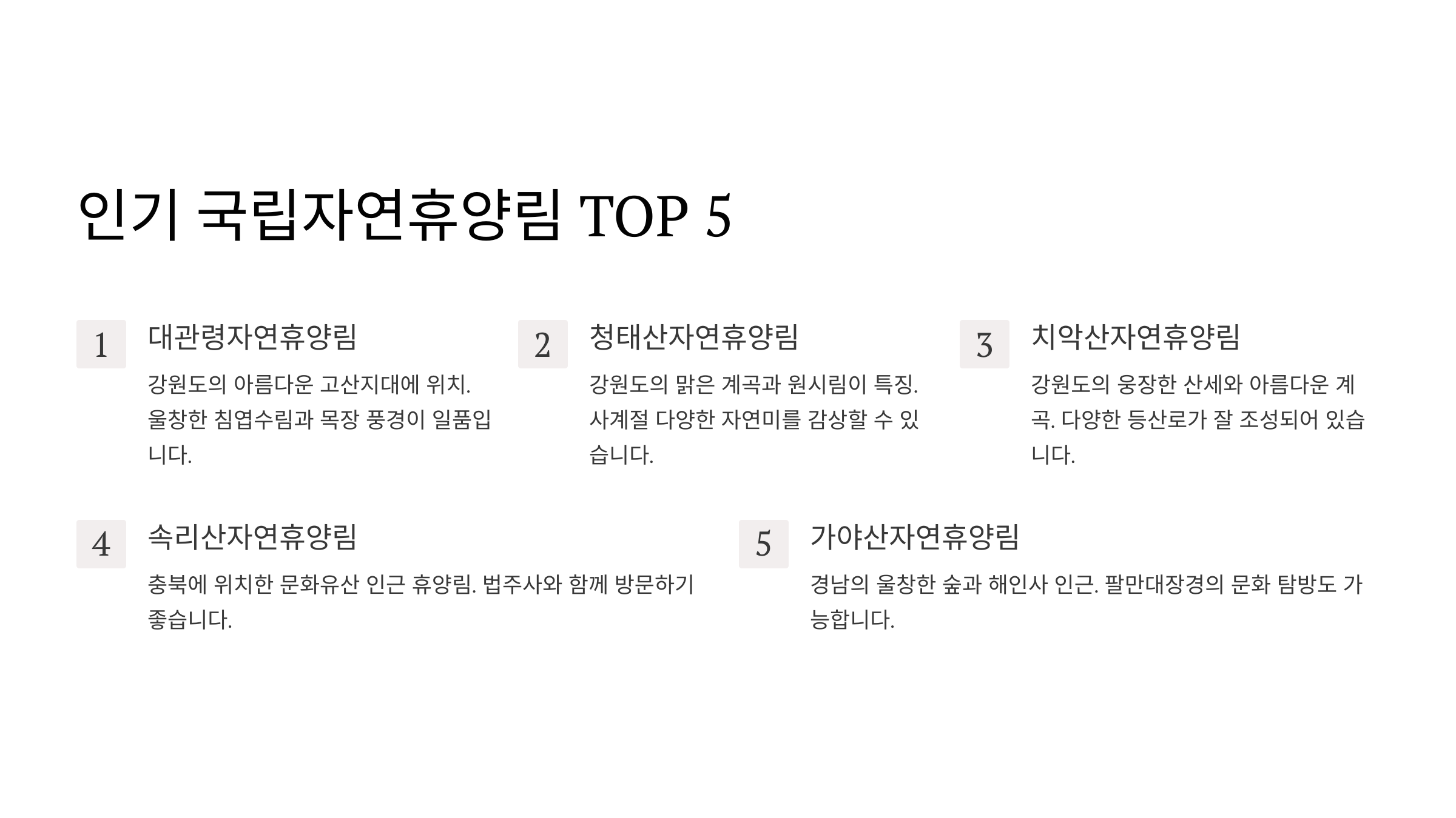 전국 43개의 국립자연휴양림 중에서 방문객들의 만족도가 높은 TOP 5를 소개할게요! 📍