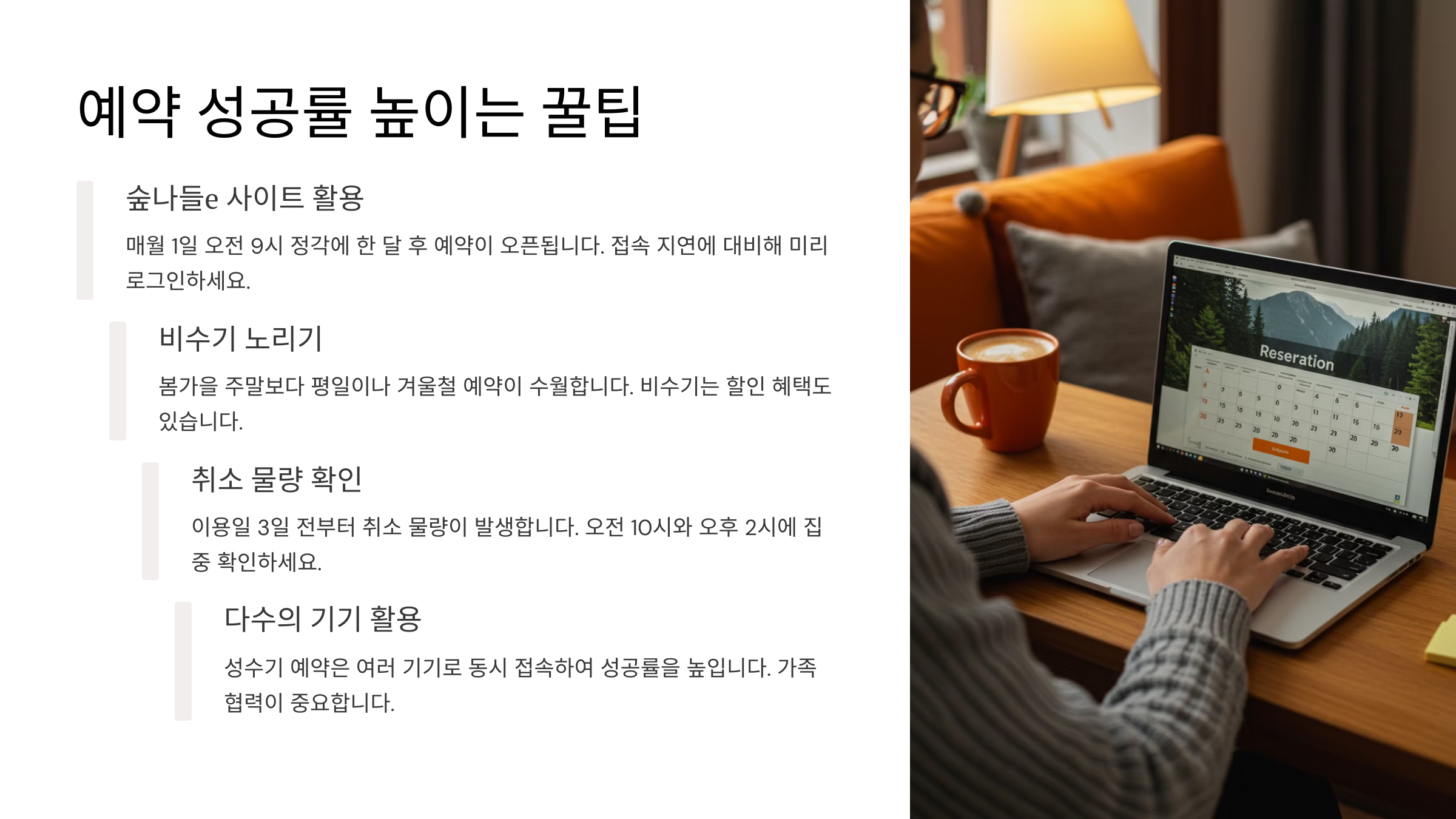 ✅ 이제 인기 휴양림의 실제 후기를 확인했어요! 다음 섹션에서는 예약 성공률을 높이는 꿀팁을 공개할게요! 🎯