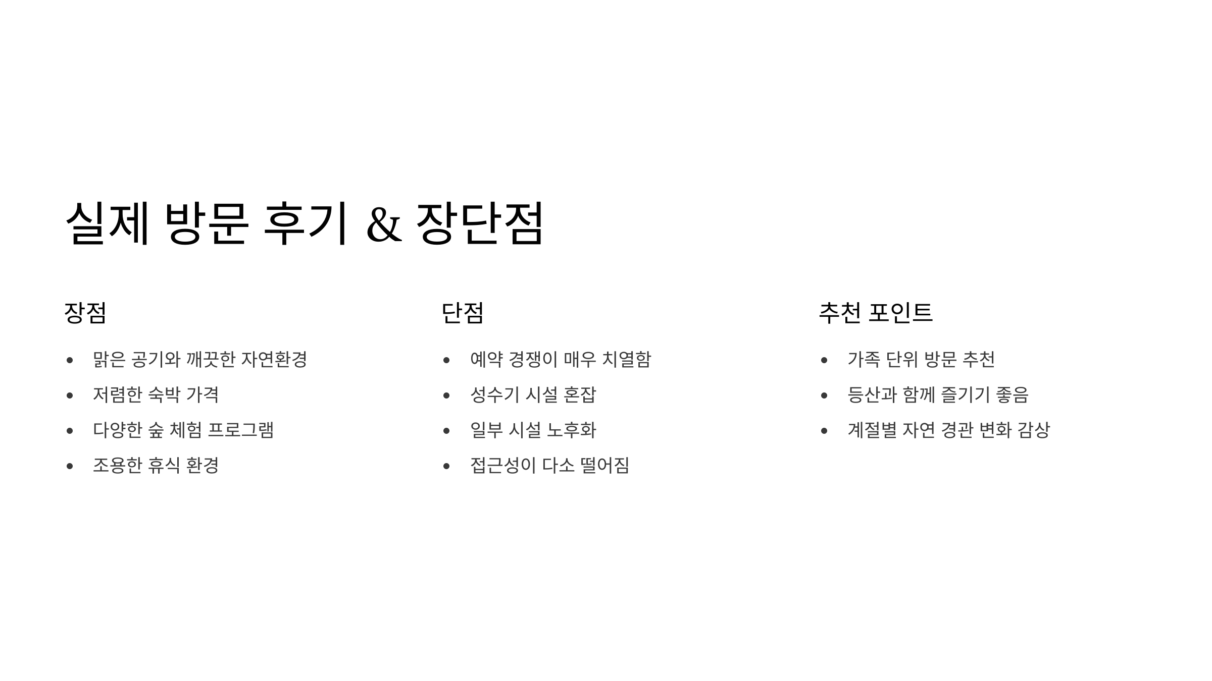 | 휴양림 | 👍 장점 | 👎 단점 | 방문객 평점 |