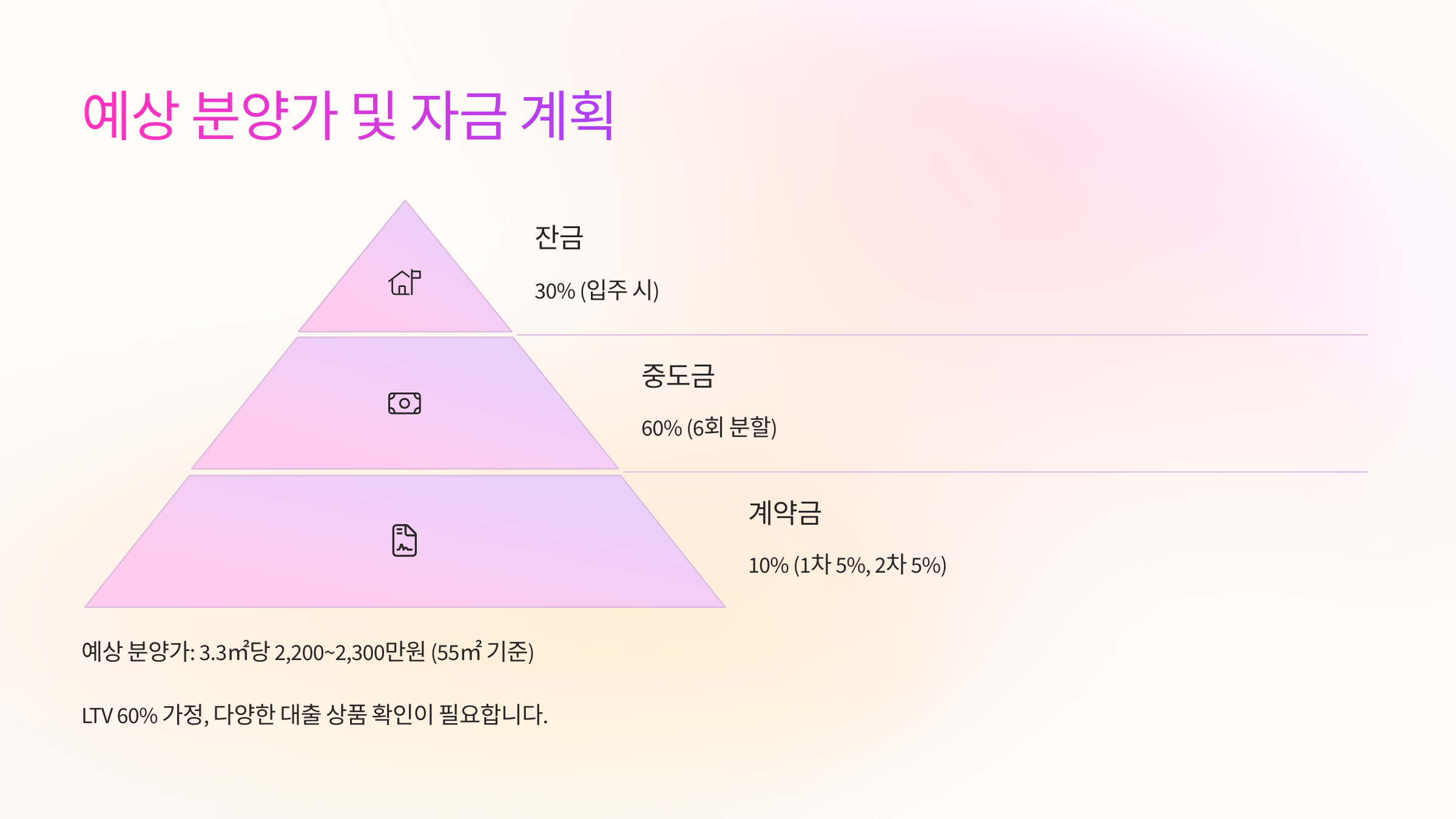 자금 계획은 계약금 10%, 중도금 40~50%, 잔금 30~40%로 나뉘고, 중도금 대출을 이용하면 부담을 줄일 수 있어요. 보금자리론, 디딤돌대출도 활용 가능해요.