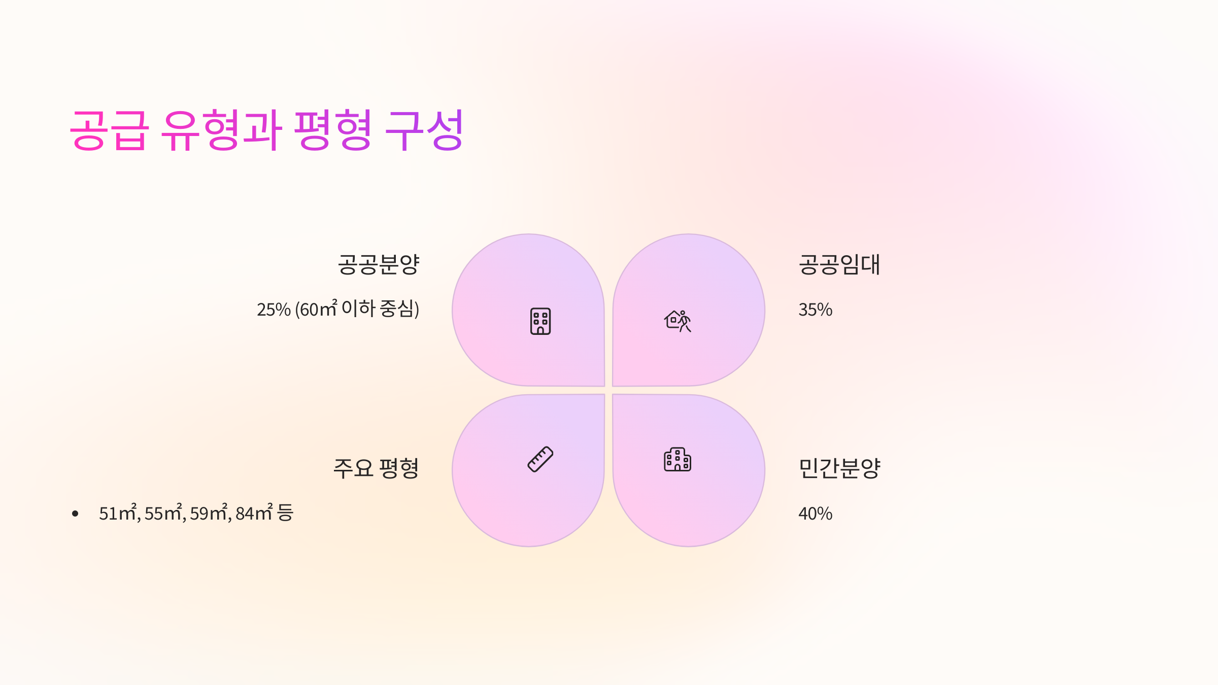 1분기에는 신혼희망타운 중심의 공공분양이 시작되고, 이어 2분기엔 민간 중대형 단지가 포함된 브랜드 아파트 공급이 이뤄질 예정이에요. 이외에도 3분기엔 행복주택 등 임대주택이, 4분기엔 다시 민간 브랜드 아파트가 공급돼요.
