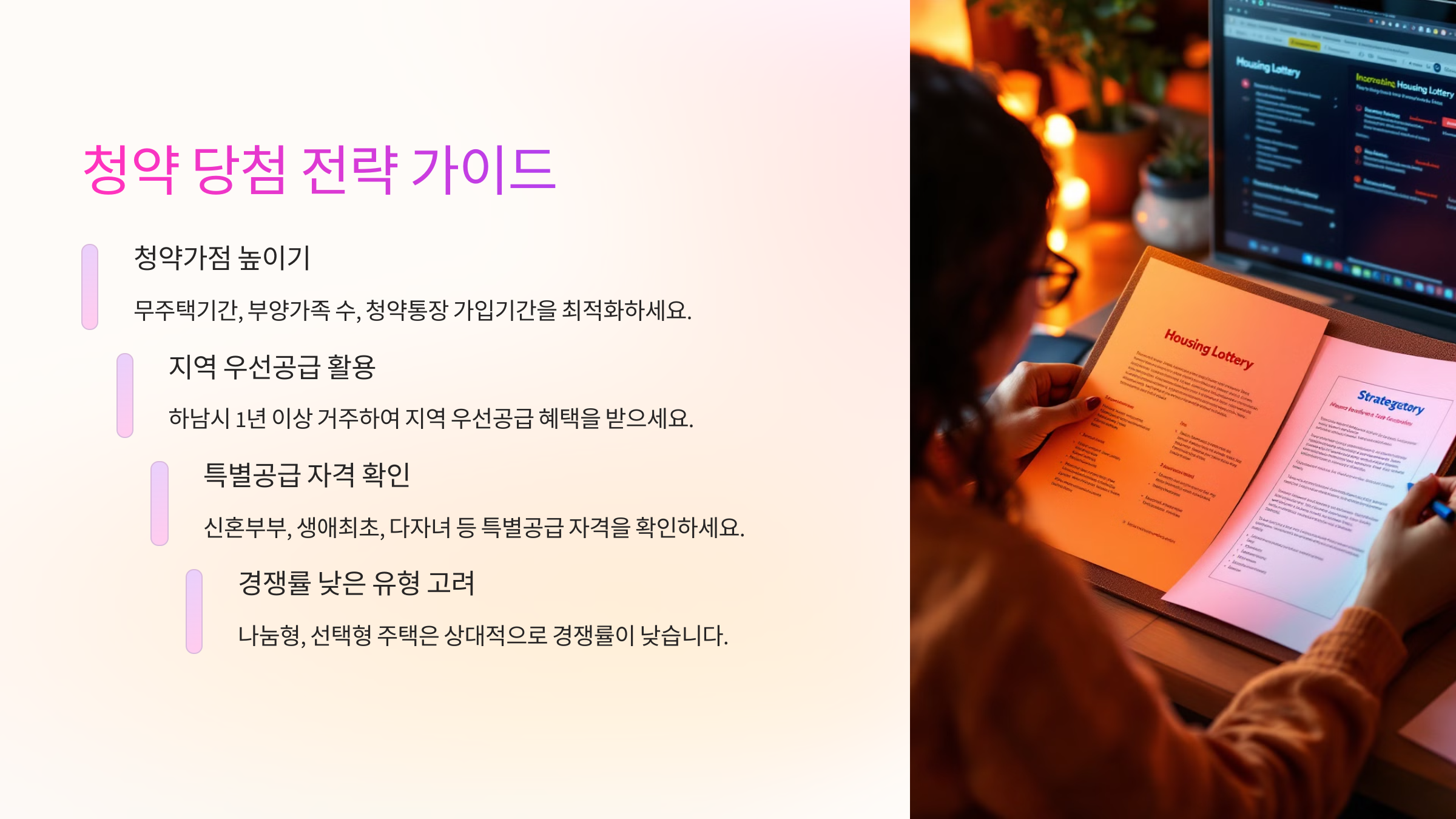 가점제도 중요한데, 무주택 기간, 부양가족 수, 청약통장 가입 기간에 따라 총 84점 만점으로 구성돼요. 특별공급은 가점보다 자격 요건 충족 여부가 중요해서 점수가 낮아도 당첨 가능성이 충분해요.