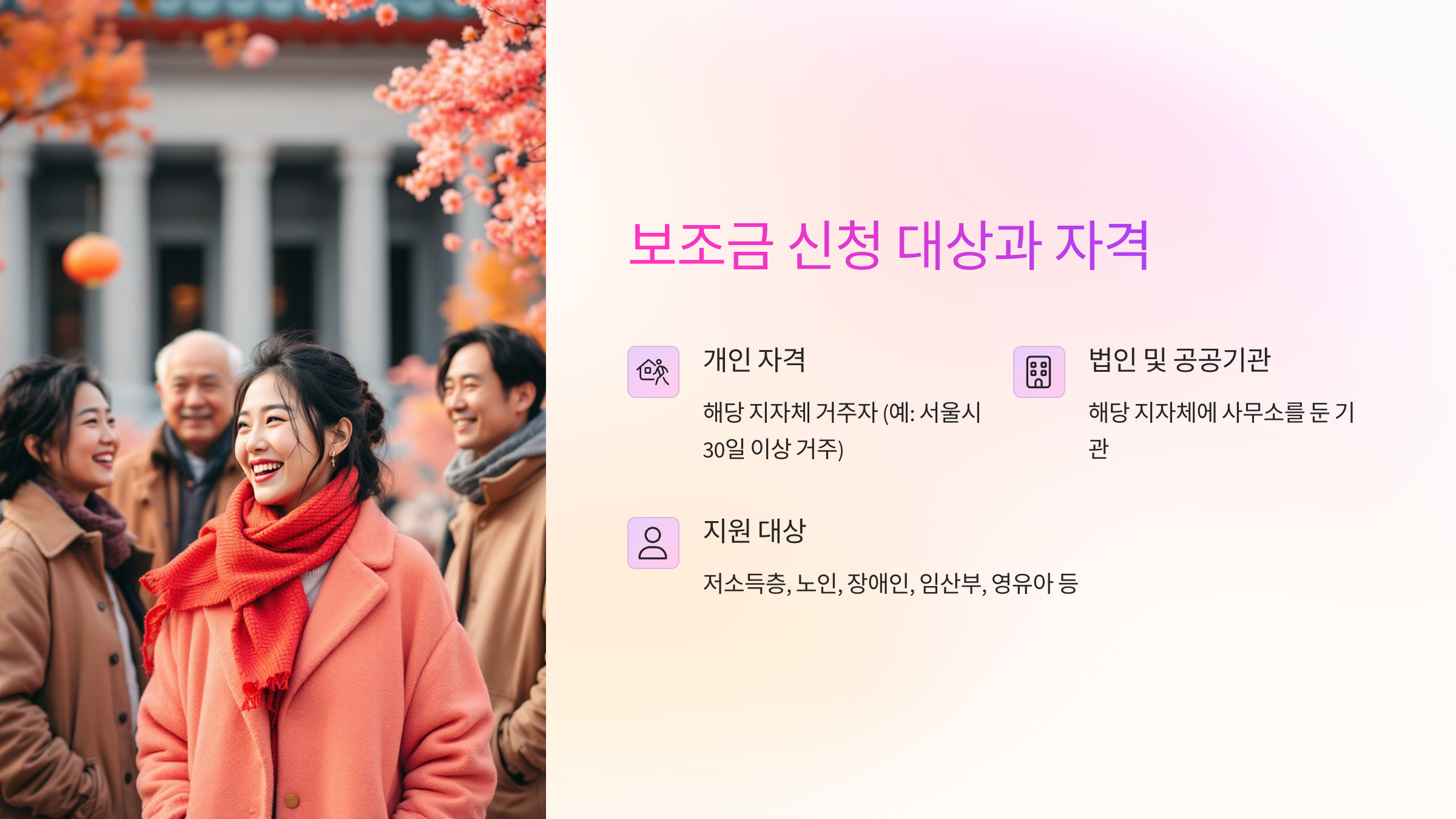 보조금은 아무나 받을 수 있는 건 아니에요. 신청 가능한 대상은 정부와 지자체가 정한 일정 조건을 만족해야 해요.