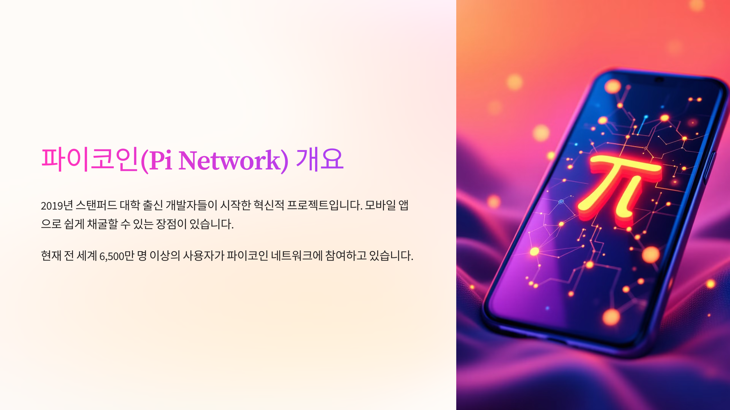 파이코인은 2019년 스탠퍼드 대학 출신 개발자들이 설립한 암호화폐 프로젝트예요. 다른 암호화폐와 달리 스마트폰 앱을 통해 무료로 채굴할 수 있다는 점에서 큰 인기를 끌었어요. 📱