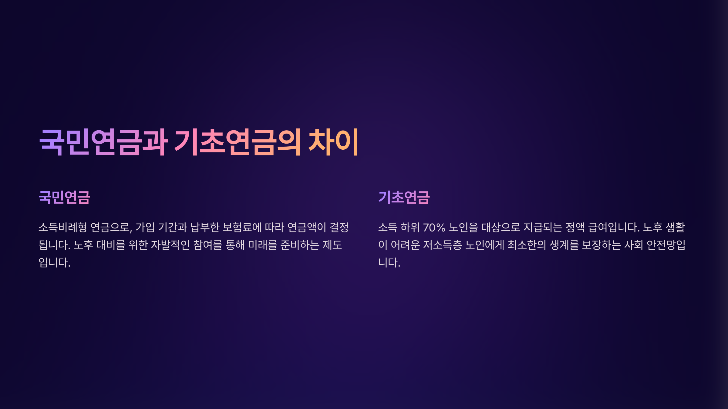 - 기초연금: 정부가 지급, 소득 하위 70% 대상
