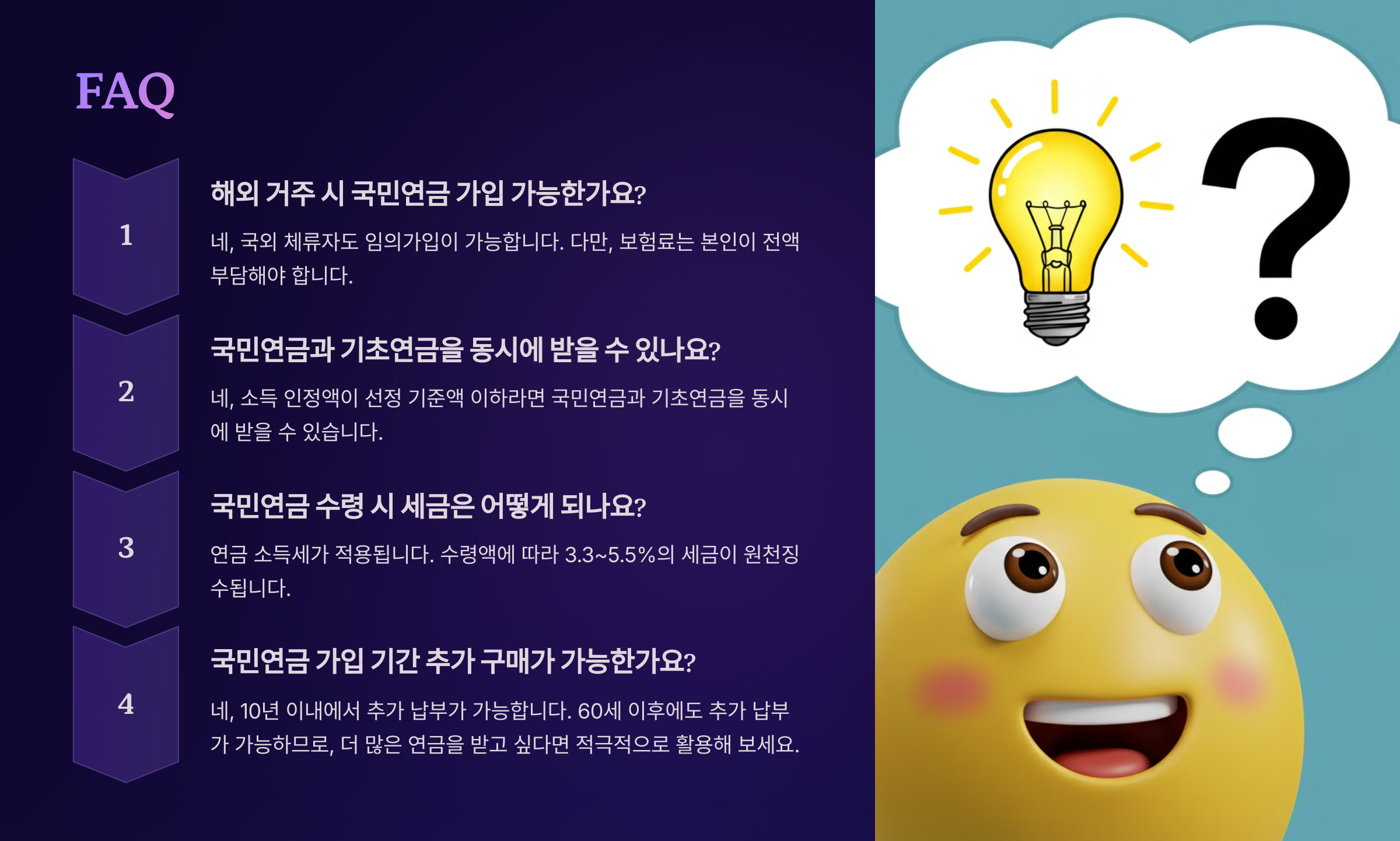 📋 목차국민연금 최소 가입기간 10년의 의미국민연금 예상수령액 계산 방법가입 기간별 예상 연금액 비교국민연금 수령 시기와 감액 기준국민연금과 기초연금 동시 수령 가능 여부국민연금 더