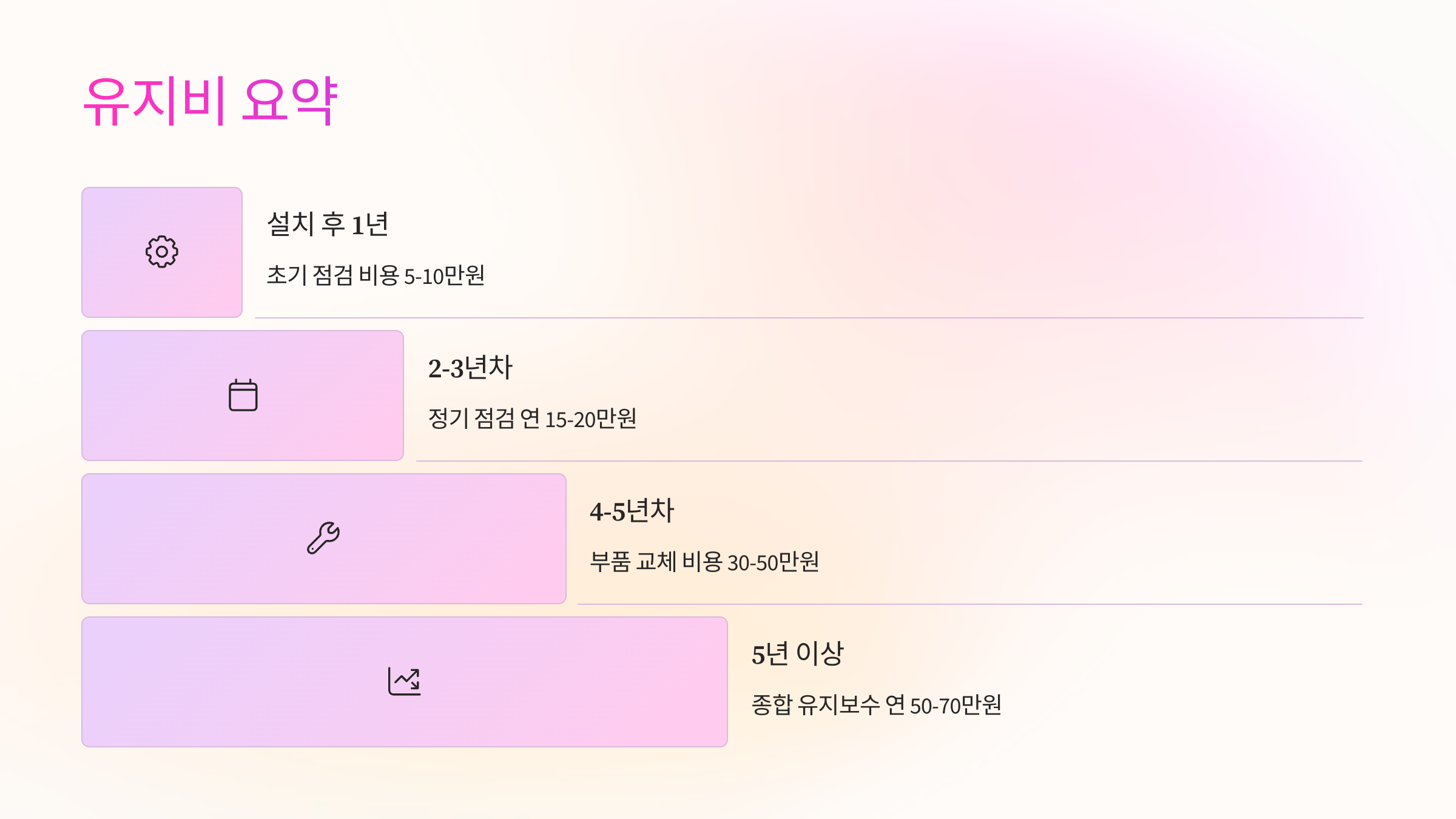 | 점검/관리 비용 | 연 10~20만 원 | 연 50~100만 원 |