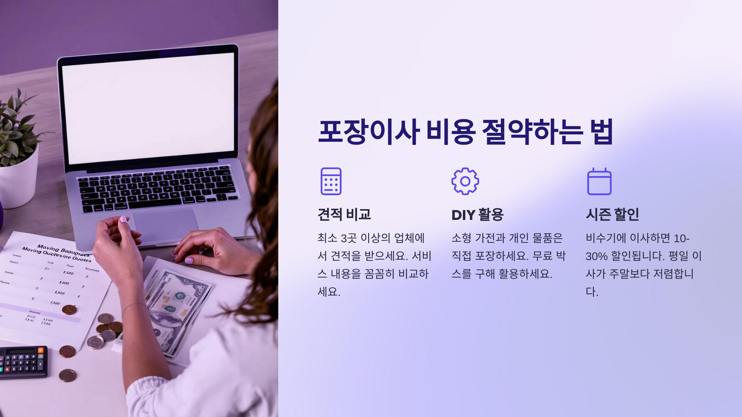 | 비수기·평일 이사 | 성수기·주말보다 저렴 | 최대 30% 절약 |