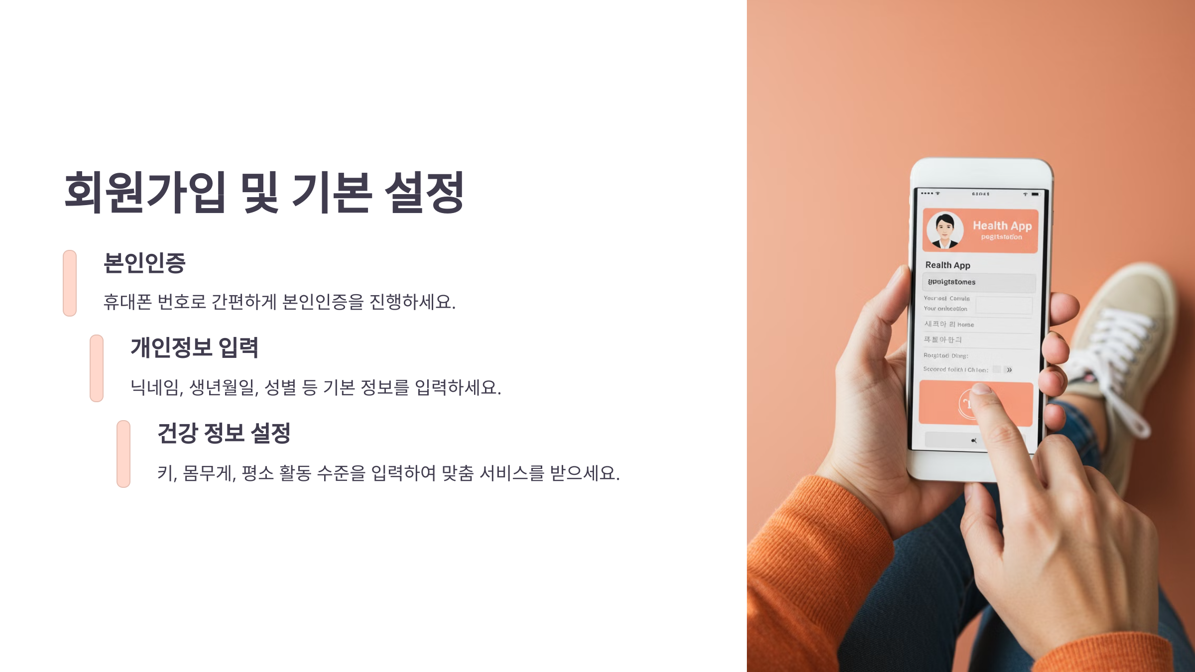 손목닥터9988을 제대로 활용하려면 회원가입과 기본 건강 정보를 설정하는 과정이 필요해요! 이 과정을 완료해야 포인트 적립, 스마트워치 연동, AI 건강 코칭 기능을 사용할 수 있어요. 🚀
