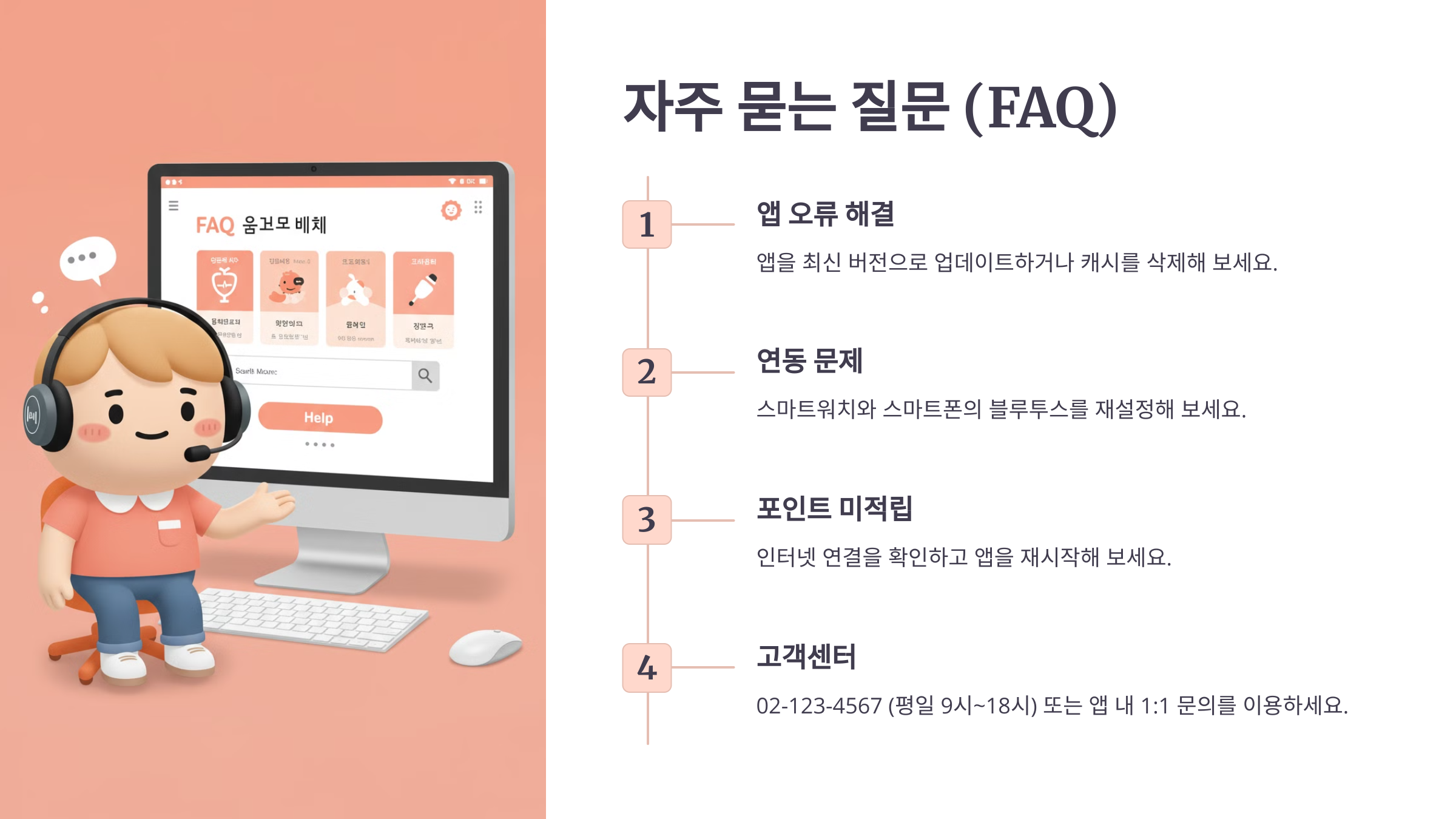 손목닥터9988의 핵심 기능을 모두 살펴봤어요! 마지막으로, 앱을 사용하면서 자주 묻는 질문(FAQ)을 정리해볼까요? ❓