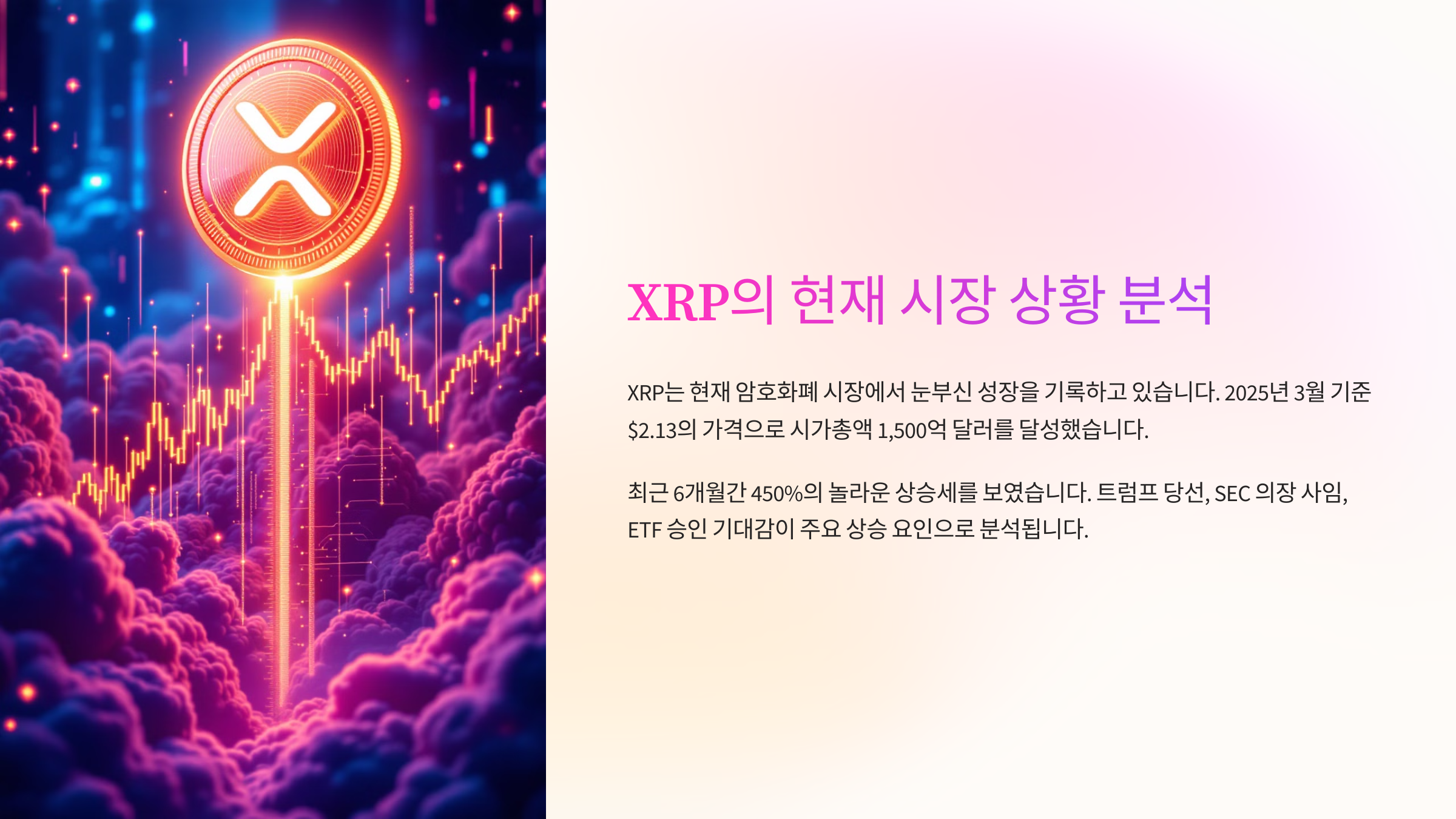 | 중립적 (Neutral) | ✔ SEC 소송 부분 승소 (일부 규제 적용) ✔ XRP 사용 사례 증가 (결제, 송금, CBDC 등) ✔ 시장 변동성 지속 ✔ 비트코인 및 암호화폐 시장 평균 상승 |