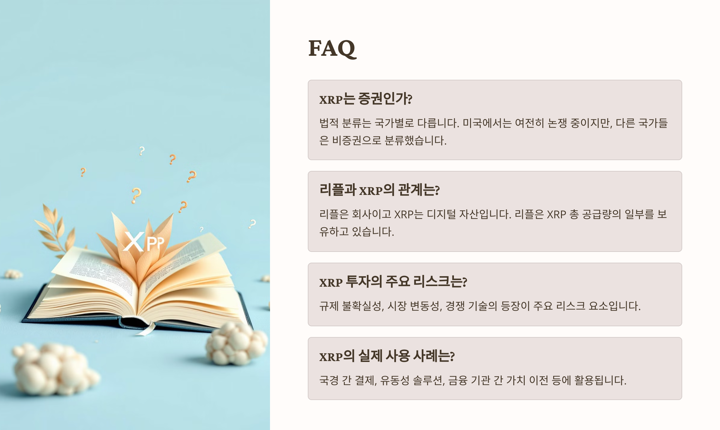 A7. 리플은 보유한 XRP를 한 번에 방출하지 않고, 일정량만 시장에 공급하고 있어요. 최근에는 공급량을 점점 줄이는 방향으로 정책을 조정하고 있기 때문에 대량 매도로 인한 급락 가능성은 낮아지고 있어요.