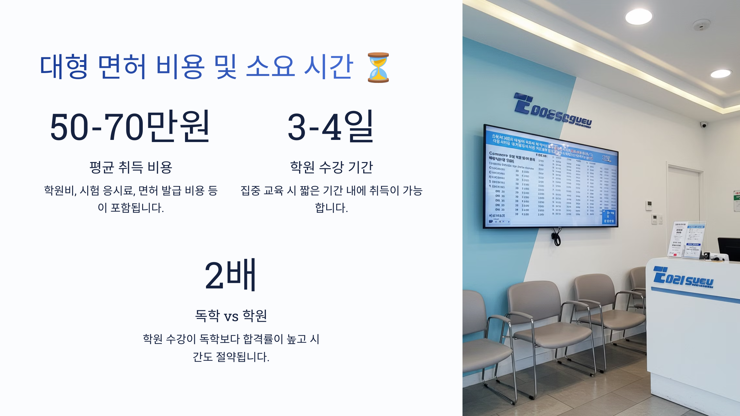 대형 면허 취득에는 시험 응시료뿐만 아니라 연습비용이 추가될 수 있어요. 학원을 이용하면 비용이 더 들지만, 합격률이 높아지는 장점이 있어요.