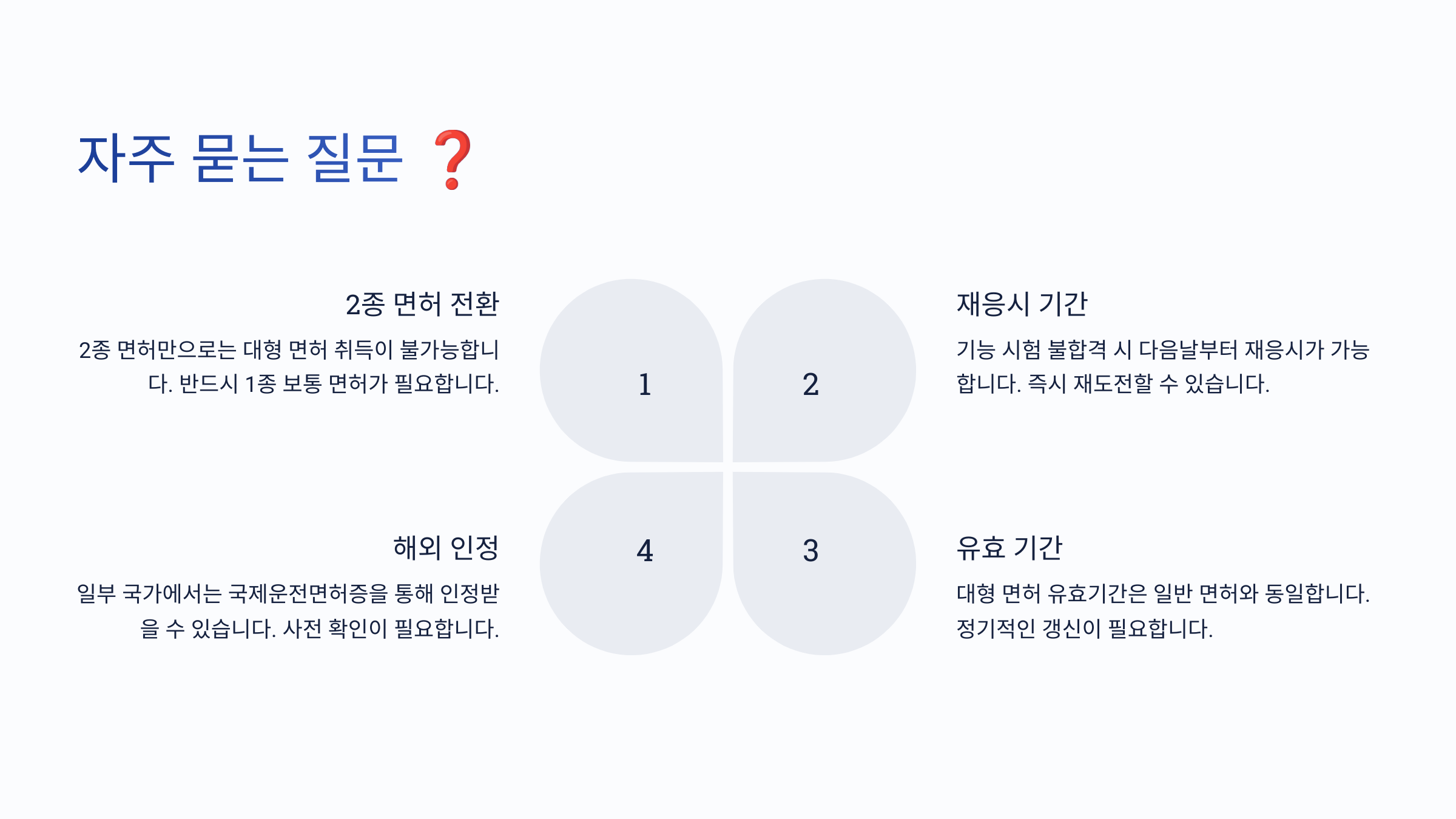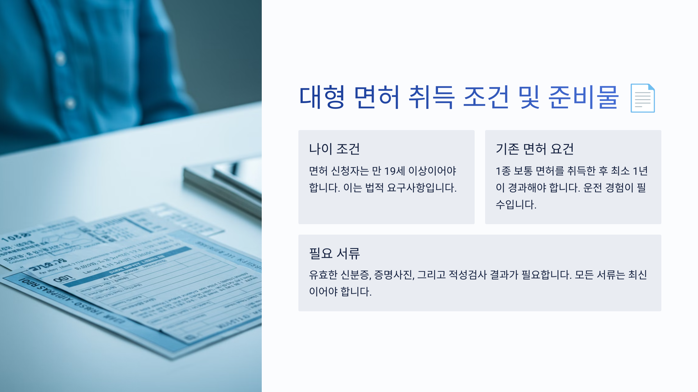 대형 면허가 있으면 취업의 기회도 더 넓어지기 때문에 많은 분들이 도전하는 면허 중 하나예요. 그럼, 대형 면허를 취득하려면 어떤 조건을 충족해야 할까요? 🔍