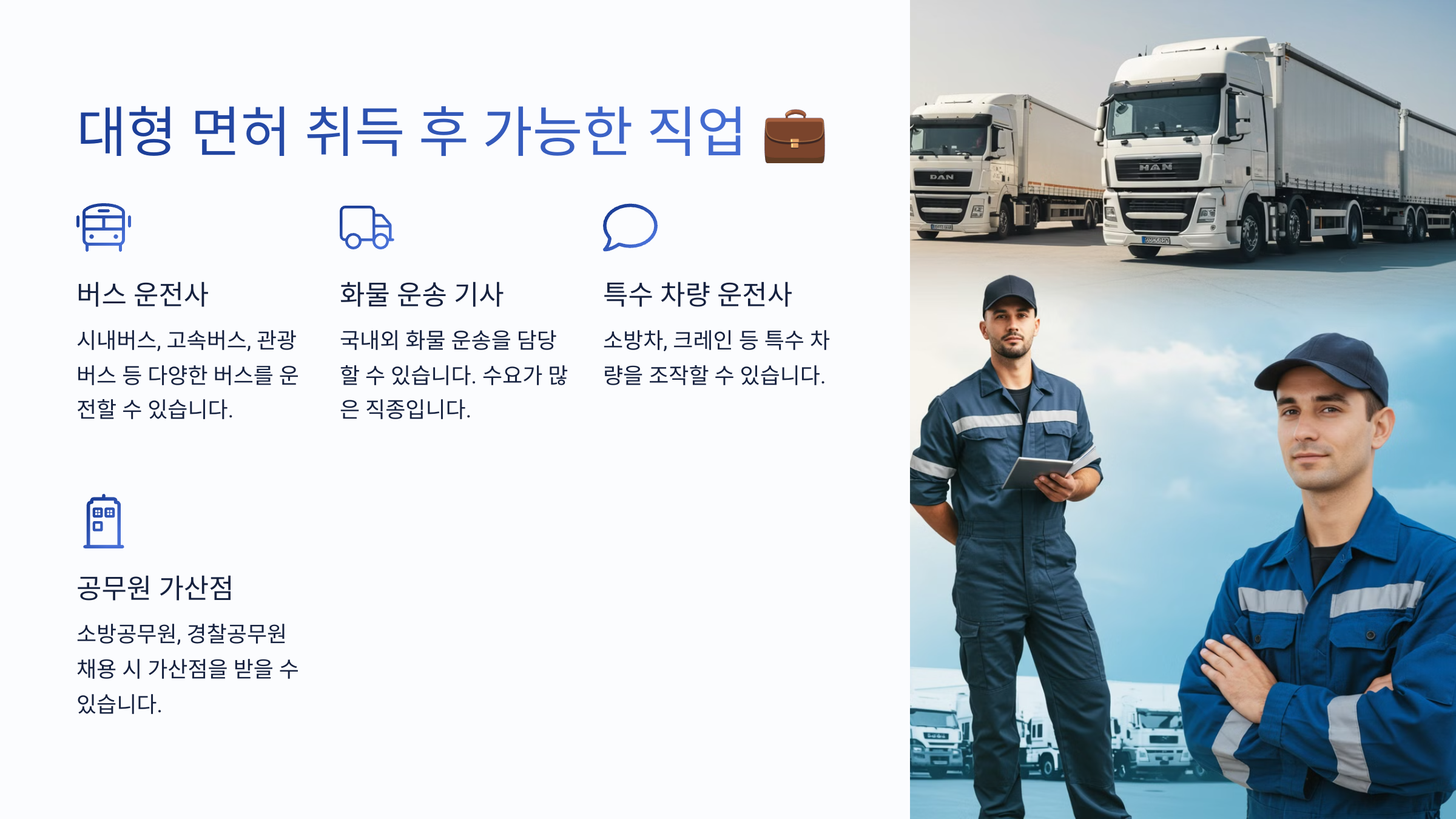 대형 면허가 있으면 일반적인 직업 외에도 공기업·공공기관 채용 시 우대받을 수도 있어요. 취업 기회를 넓히려면 대형 면허 취득을 고려해보는 것도 좋아요! 🚛