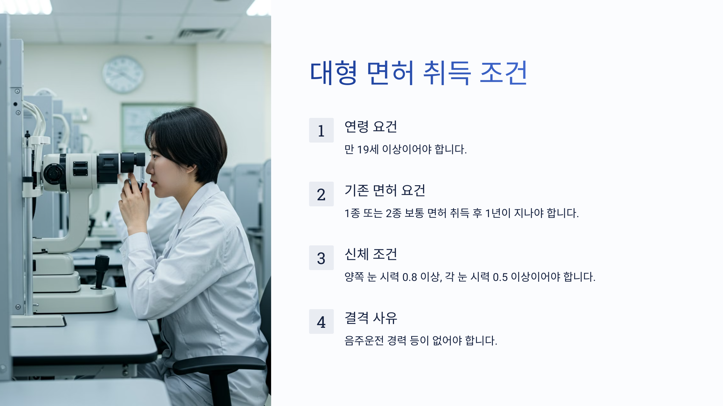 대형 면허를 취득하려면 일정한 운전 경력과 신체 조건을 충족해야 해요. 1종 보통 면허를 소지한 후 일정 기간이 지나야 시험에 응시할 수 있어요.