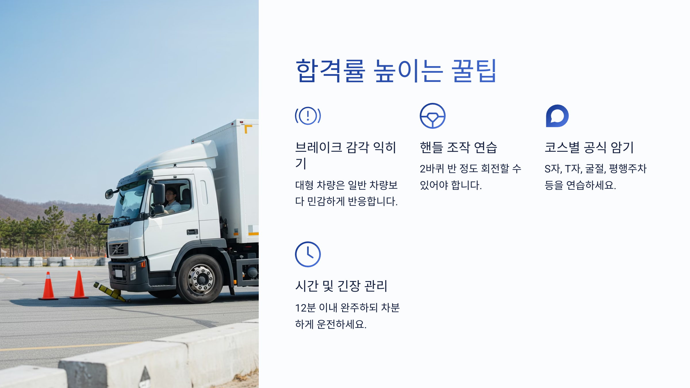 특히 기능시험에서는 후진 주차와 차폭 감각을 익히는 것이 중요해요. 실격하지 않으려면 시험 전 충분히 연습하는 것이 필수예요! 🚛