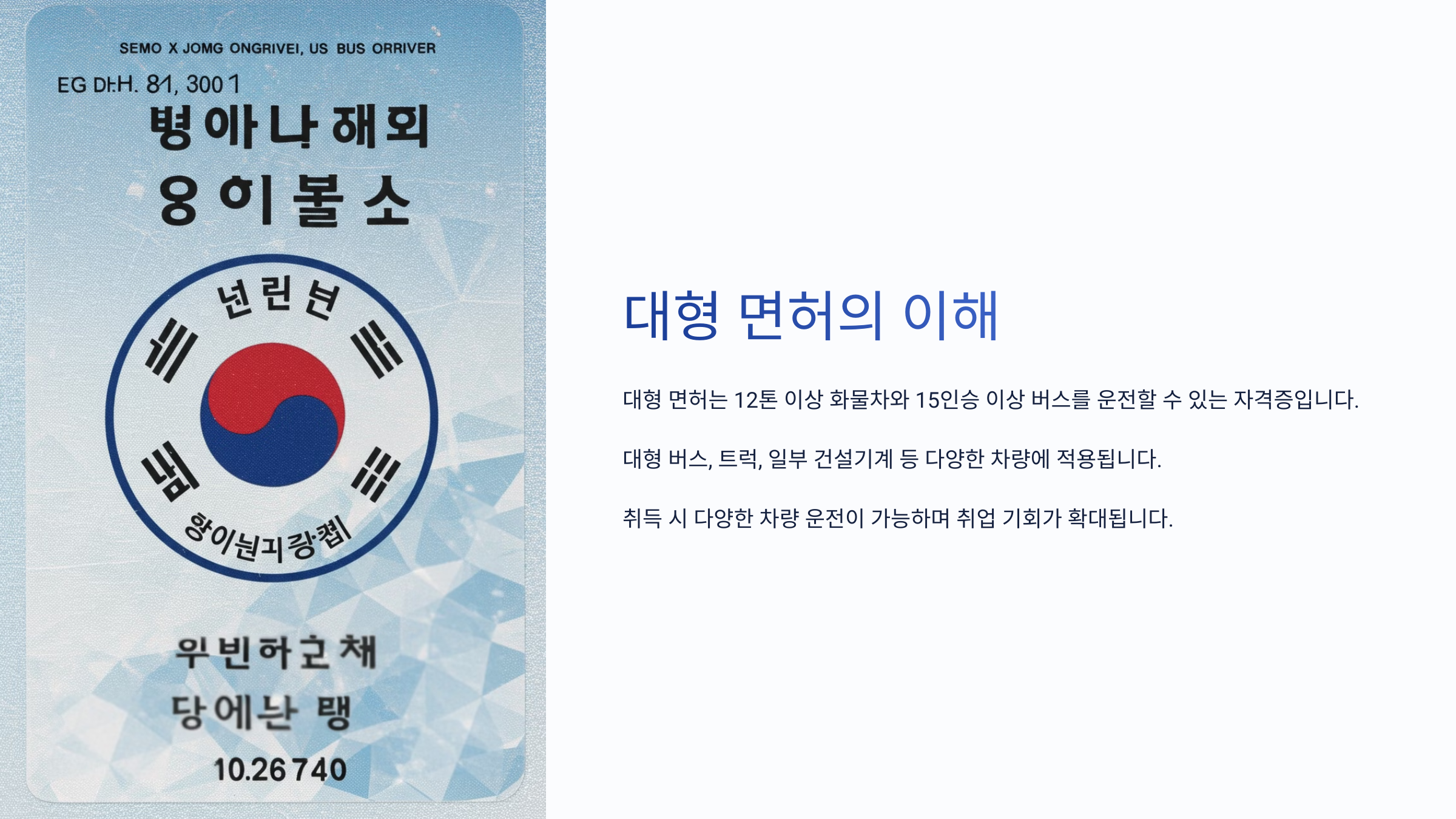태그: 대형면허, 대형면허시험, 버스면허, 트럭운전, 화물차운전, 운전면허취득, 도로주행, 운전직취업, 특수면허, 면허시험장
