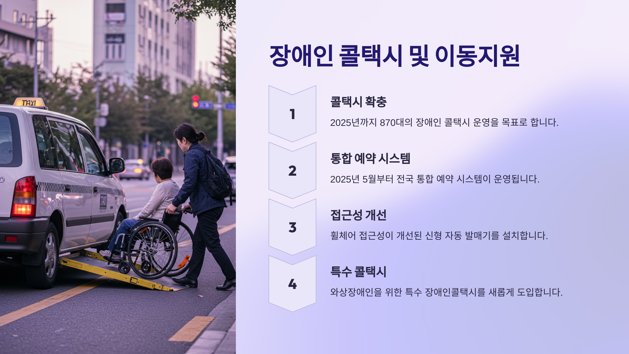 장애인의 이동 편의를 높이기 위해 2025년부터 장애인 콜택시 서비스가 개선돼요. 기존 예약제 운영 방식에서 즉시 호출 시스템이 추가되며, 운영 지역도 확대될 예정이에요.