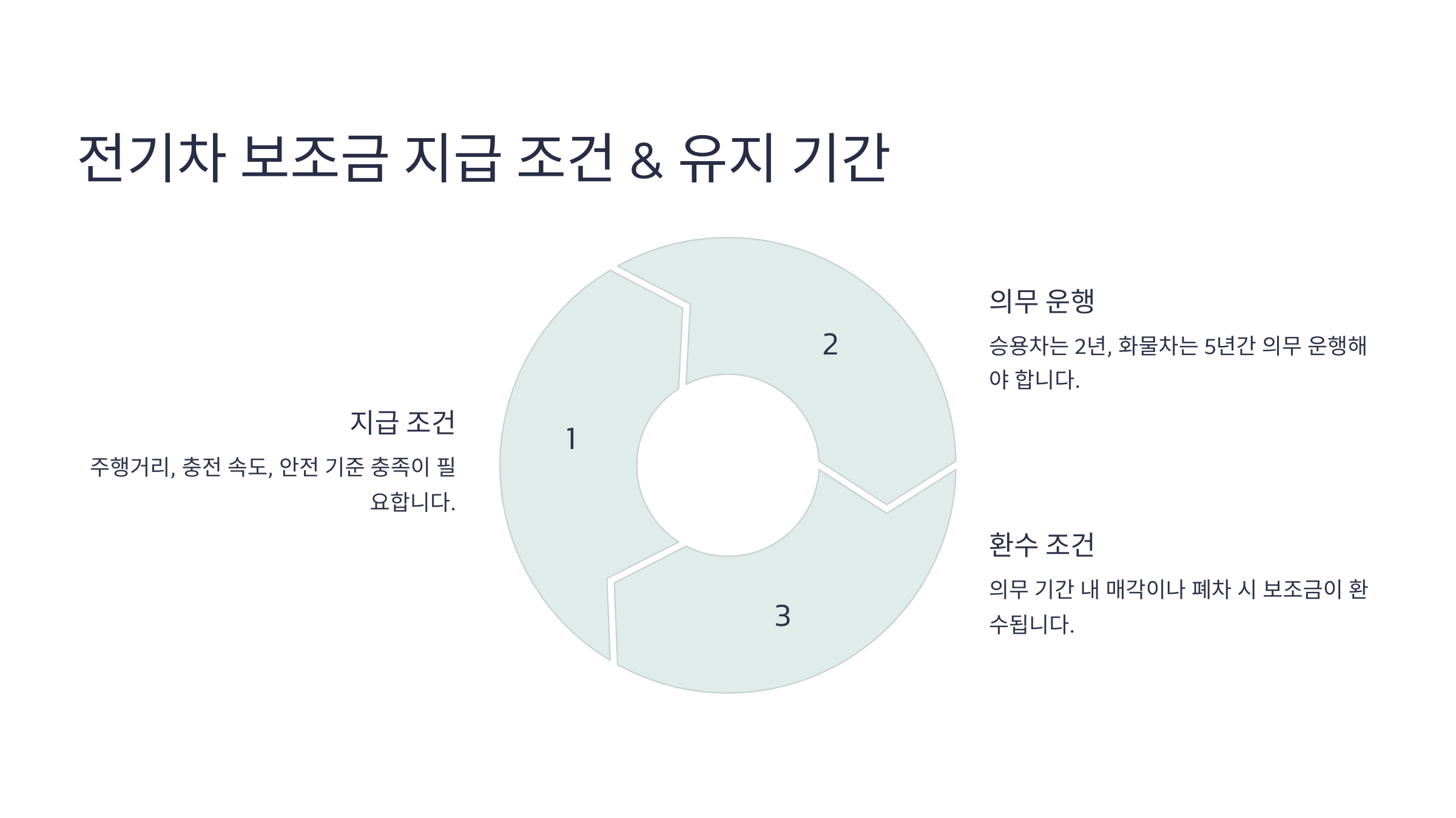 전기차 보조금을 받기 위해서는 일정한 조건을 충족해야 해요. 또한, 차량을 일정 기간 유지해야 보조금을 반환하지 않아도 돼요! 🚗💰
