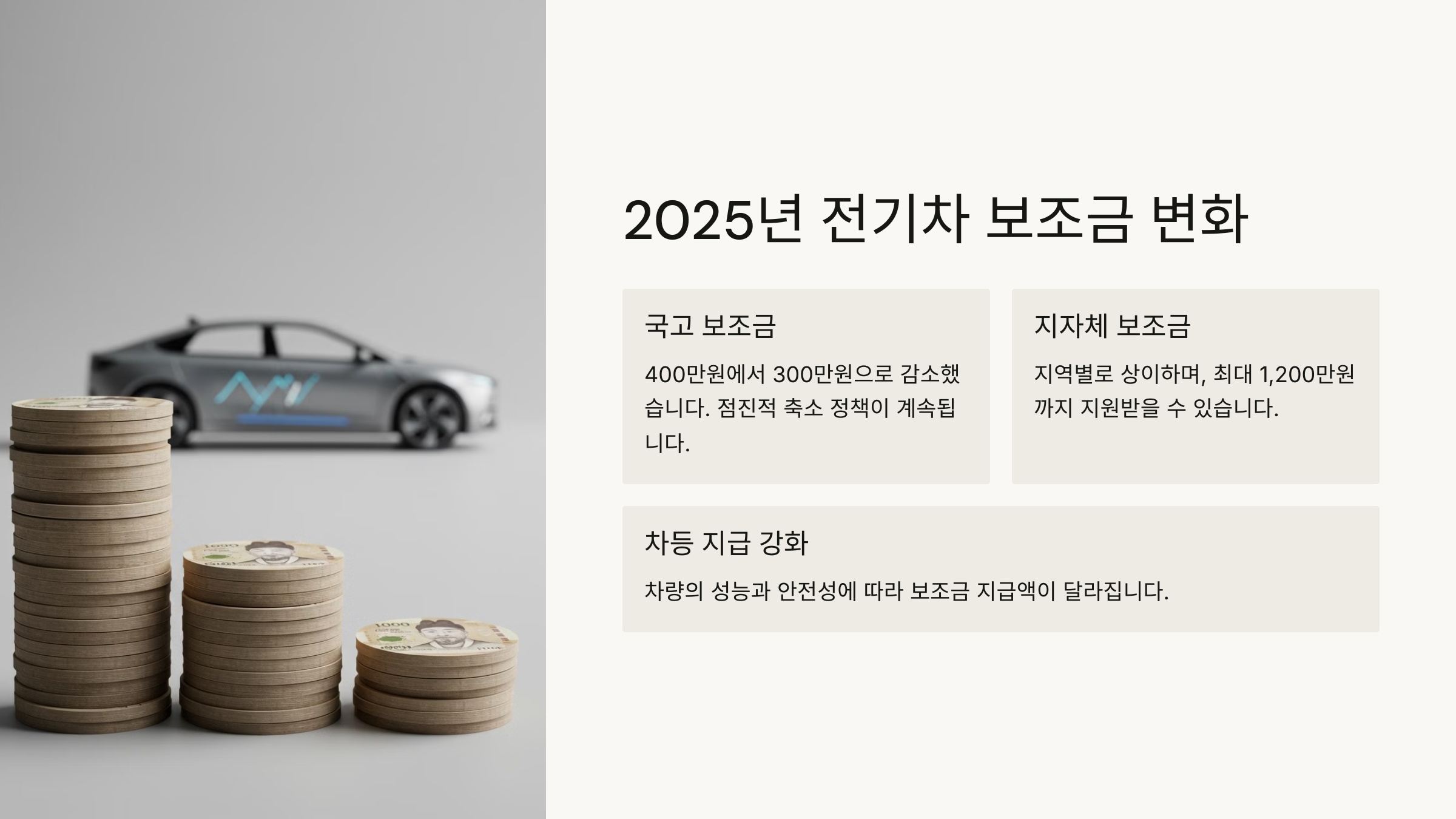 정부는 전기차 보급이 일정 수준에 도달했다고 판단해 2025년부터 보조금을 축소했어요. 이에 따라 소비자가 실제 부담해야 하는 차량 가격이 평균 300~500만 원가량 증가했어요. 📉