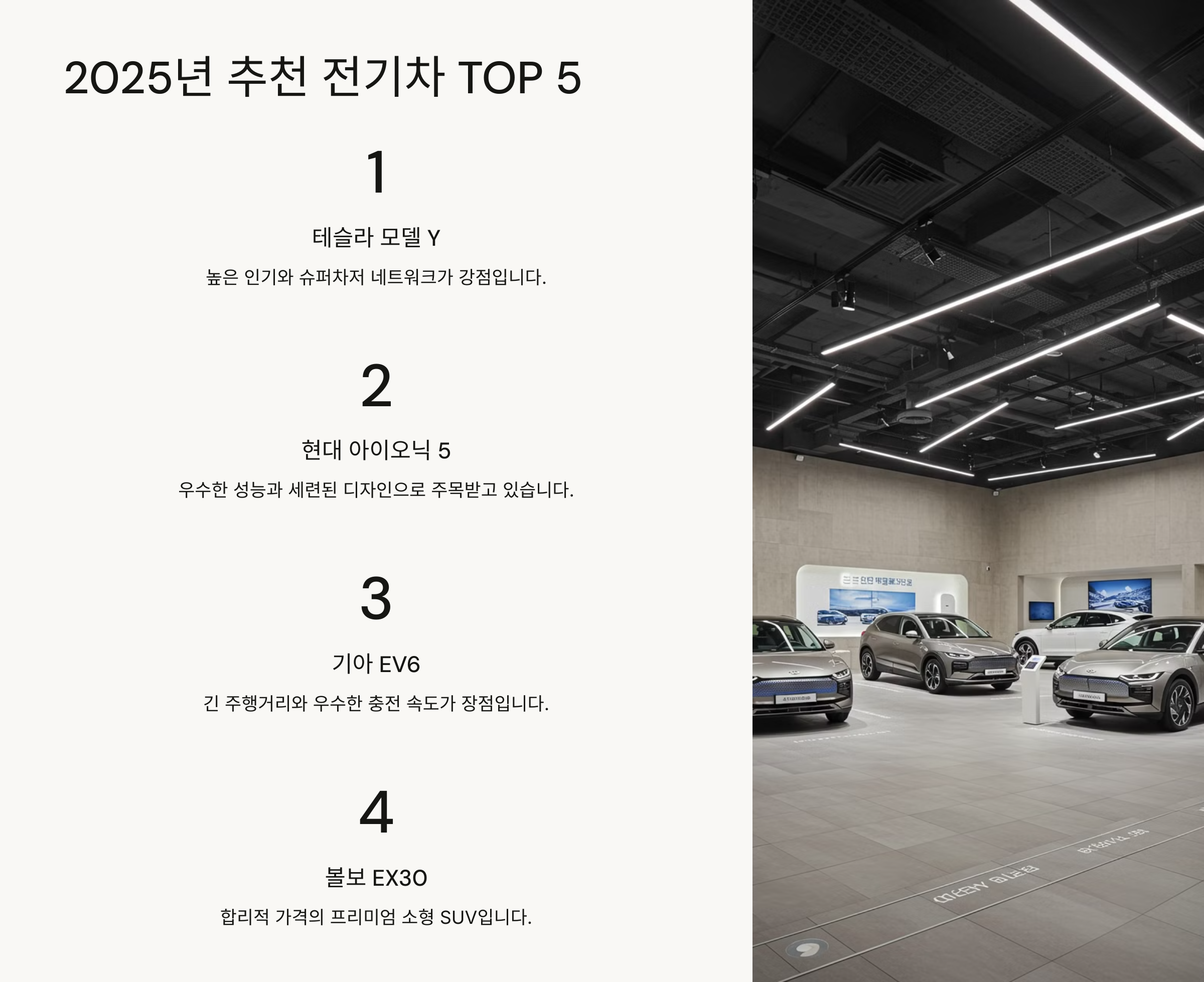 📌 다음 섹션에서는 "2025년 추천 전기차 TOP 5"를 소개할게요! 🏆