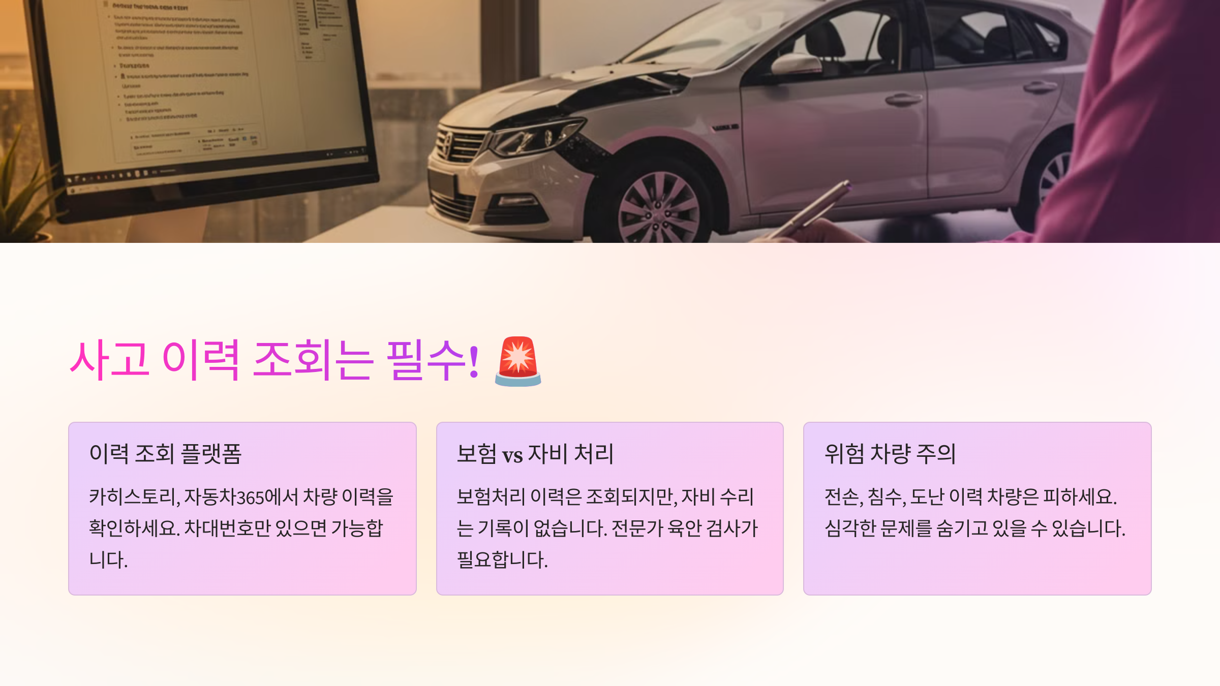 이제 사고 이력 조회 방법을 살펴볼 차례예요! 🚨 다음 섹션에서 사고차를 피하는 방법을 알려드릴게요.