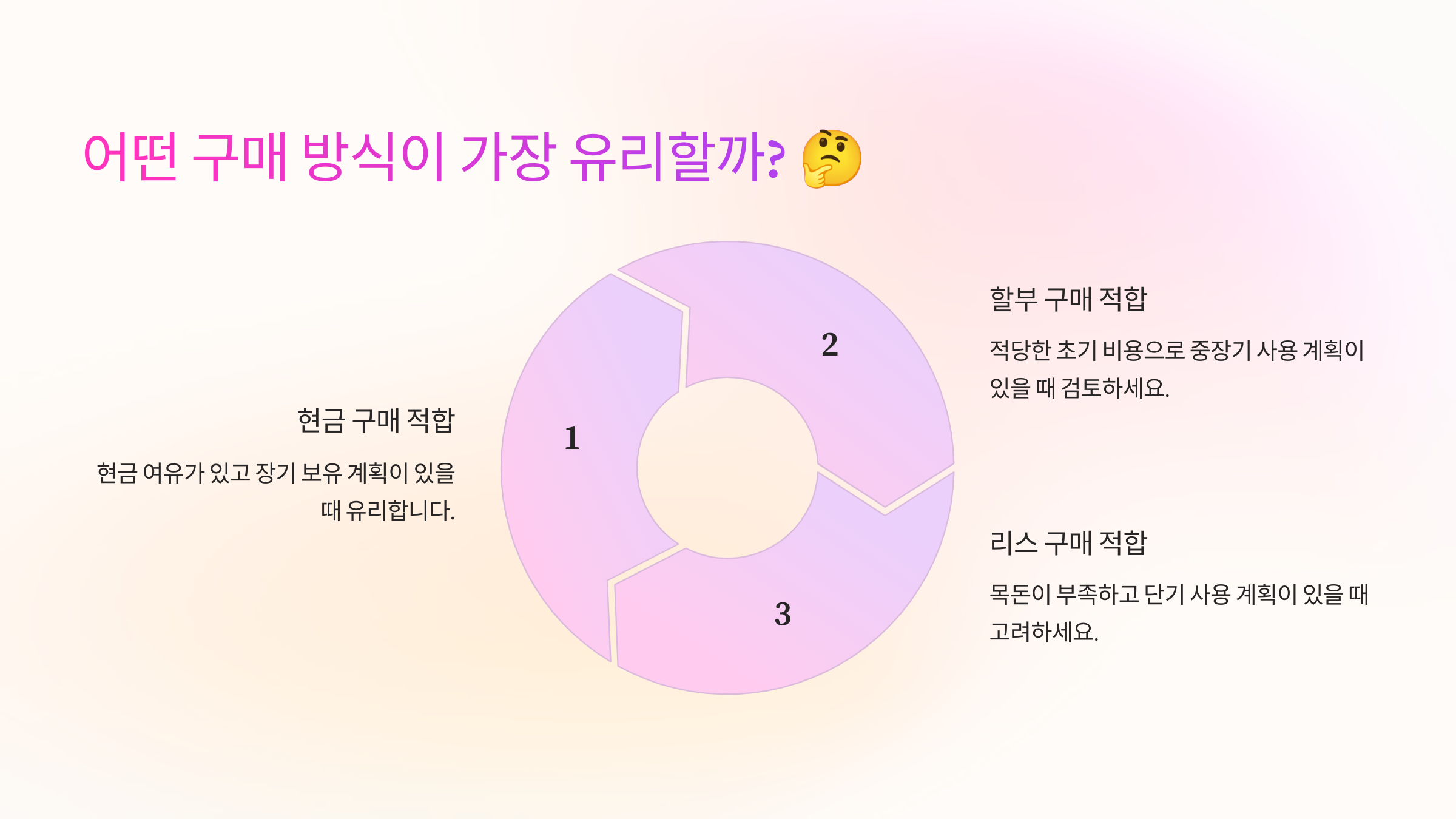 그럼, 현금, 할부, 리스 중 어떤 방식이 가장 유리할까요? 🤔 다음 섹션에서 구매 방식별 추천 대상을 정리해볼게요!