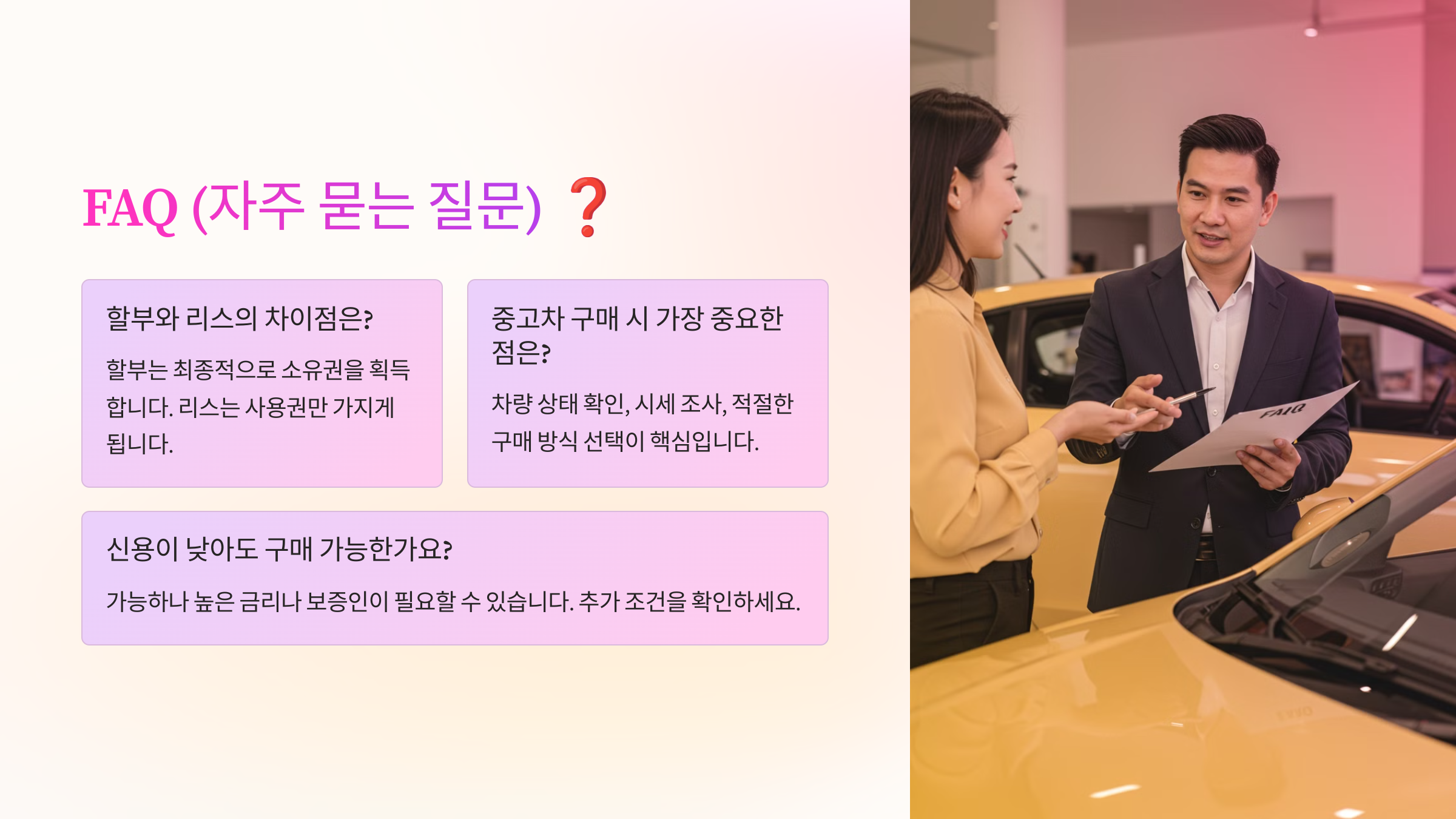 💡 금융상품을 잘 활용하면 중고차 구매 부담을 줄일 수 있지만, 신중한 선택이 필요해요! 이제 마지막으로, 자주 묻는 질문(FAQ)을 확인해볼까요? ❓