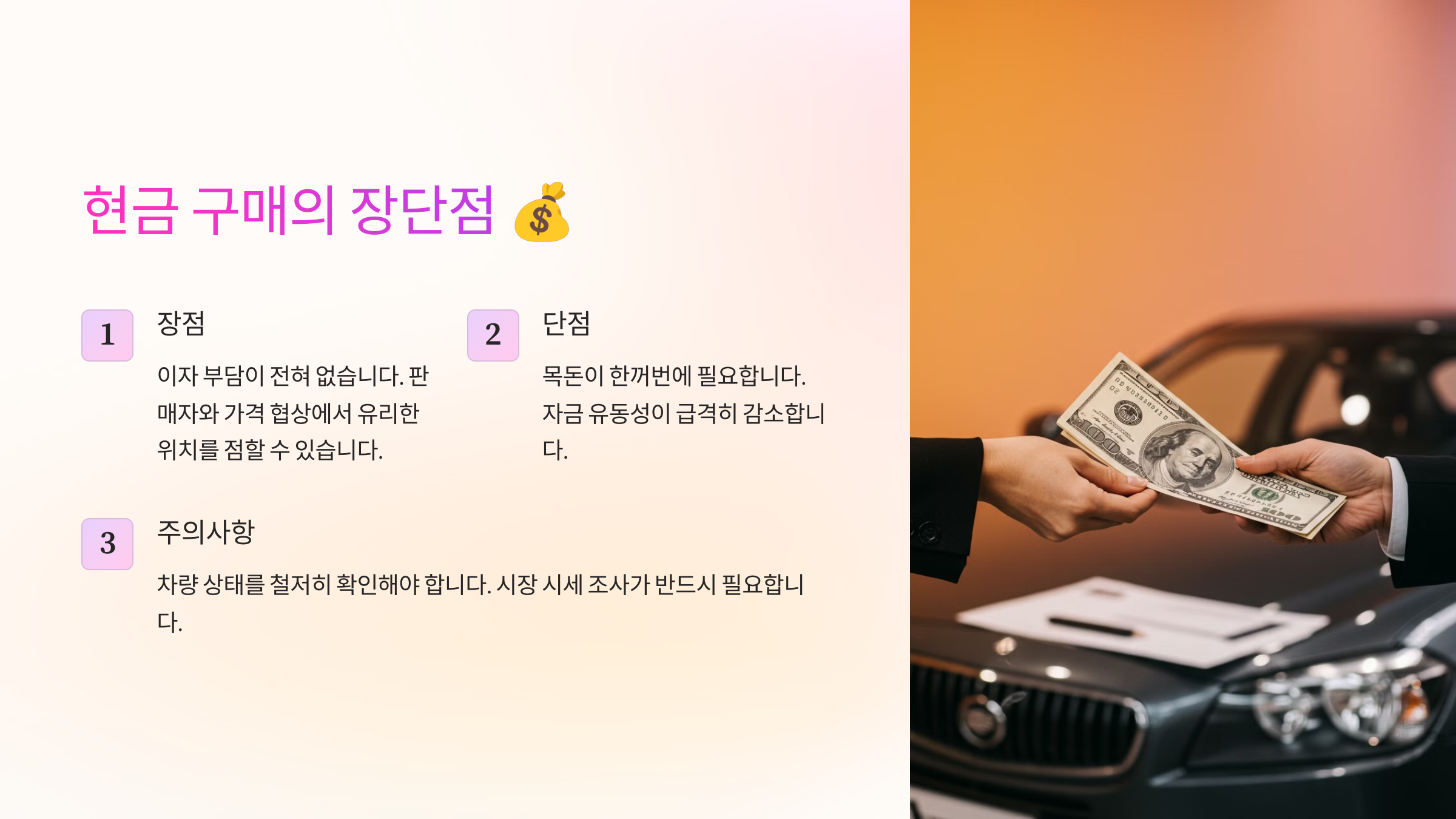 💡 현금 구매는 이자가 없고 소유권을 빠르게 가져올 수 있다는 점에서 매력적인 방식이에요. 하지만 목돈이 들어가고, 자금 유동성이 줄어들 수 있기 때문에 신중한 결정이 필요해요! ✅