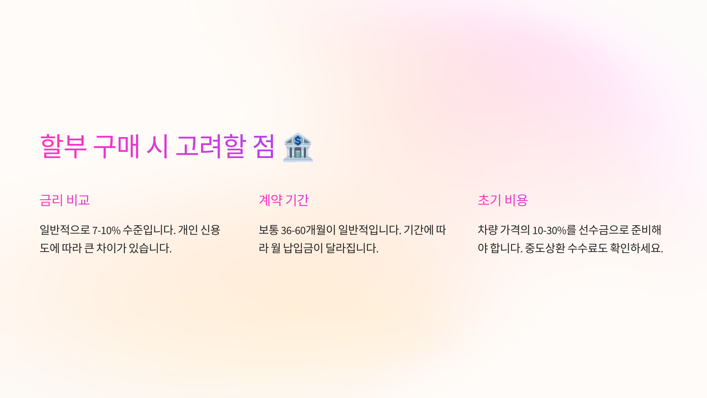 | 🏦 할부 | 초기 부담 적음, 원하는 차량 구매 가능 | 이자 부담 있음 | 목돈 없이 차량 구매 원하는 경우 |