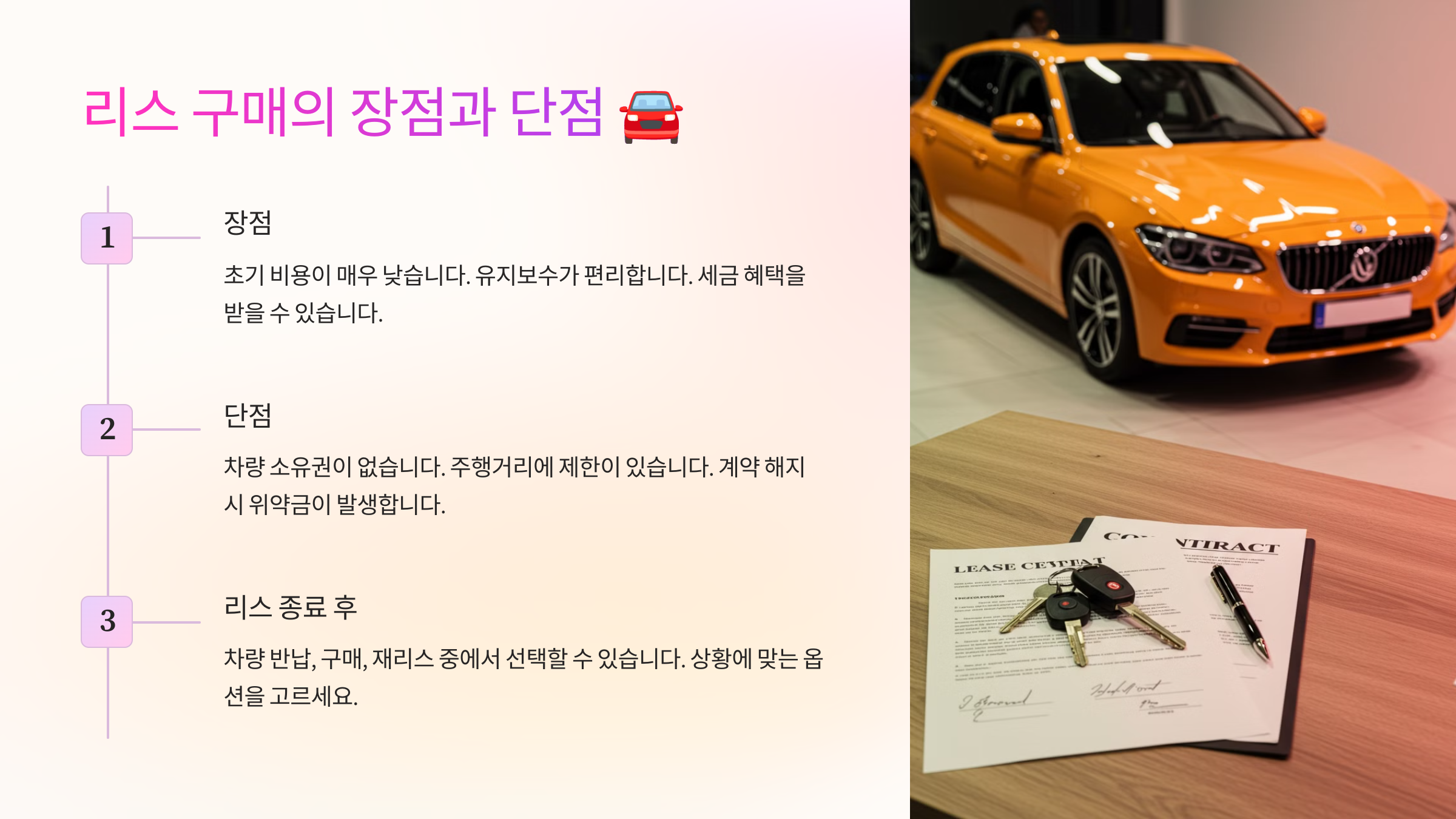 할부 구매는 초기 부담이 적어 접근성이 좋지만, 장기적으로 보면 이자 부담이 클 수 있어요. 🚗 이제 리스 구매는 어떤 장점과 단점이 있는지 알아볼 차례예요! 다음 섹션에서 리스 구매의 특징을 살펴볼게요. 🚘