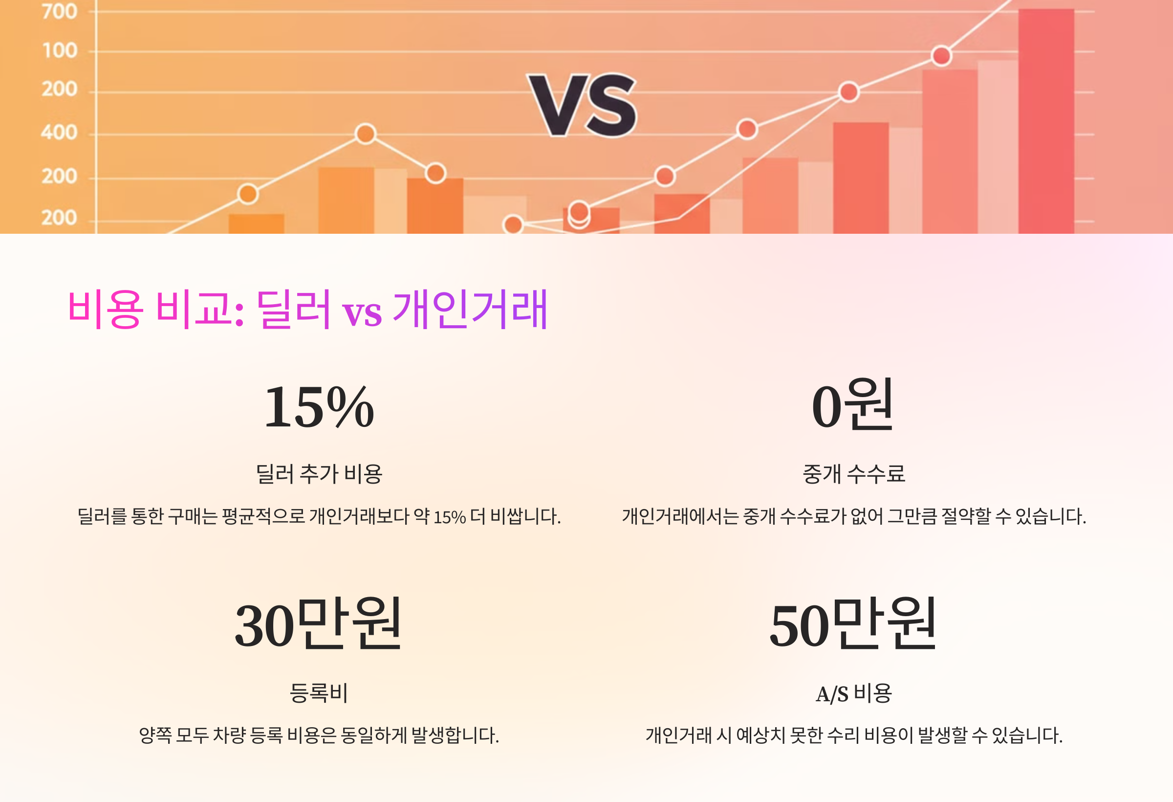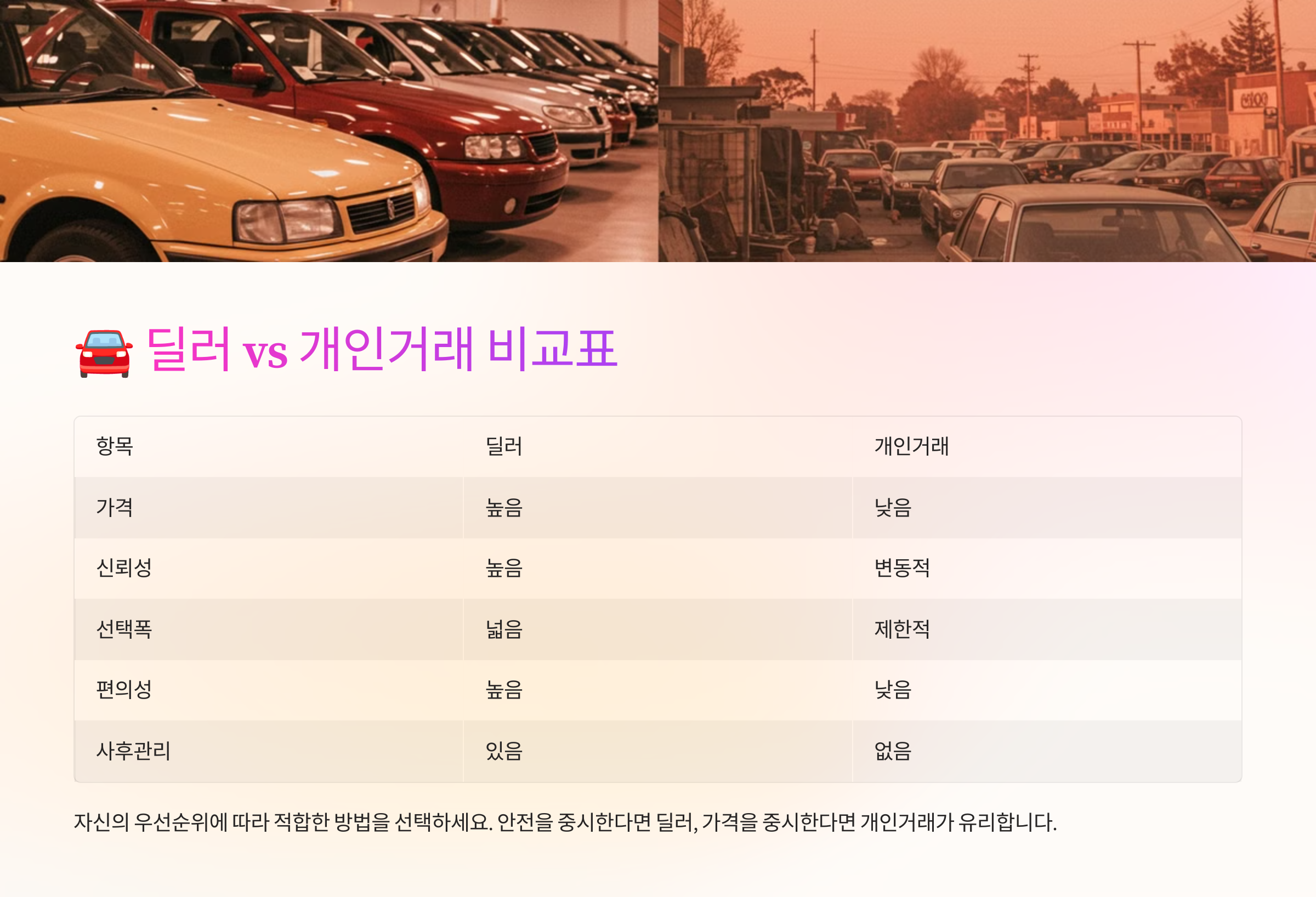 🚗 TIP: "중고차 구매가 처음이라면 딜러 거래가 더 안전하고, 가격을 최대한 절약하고 싶다면 개인거래가 유리해요!"