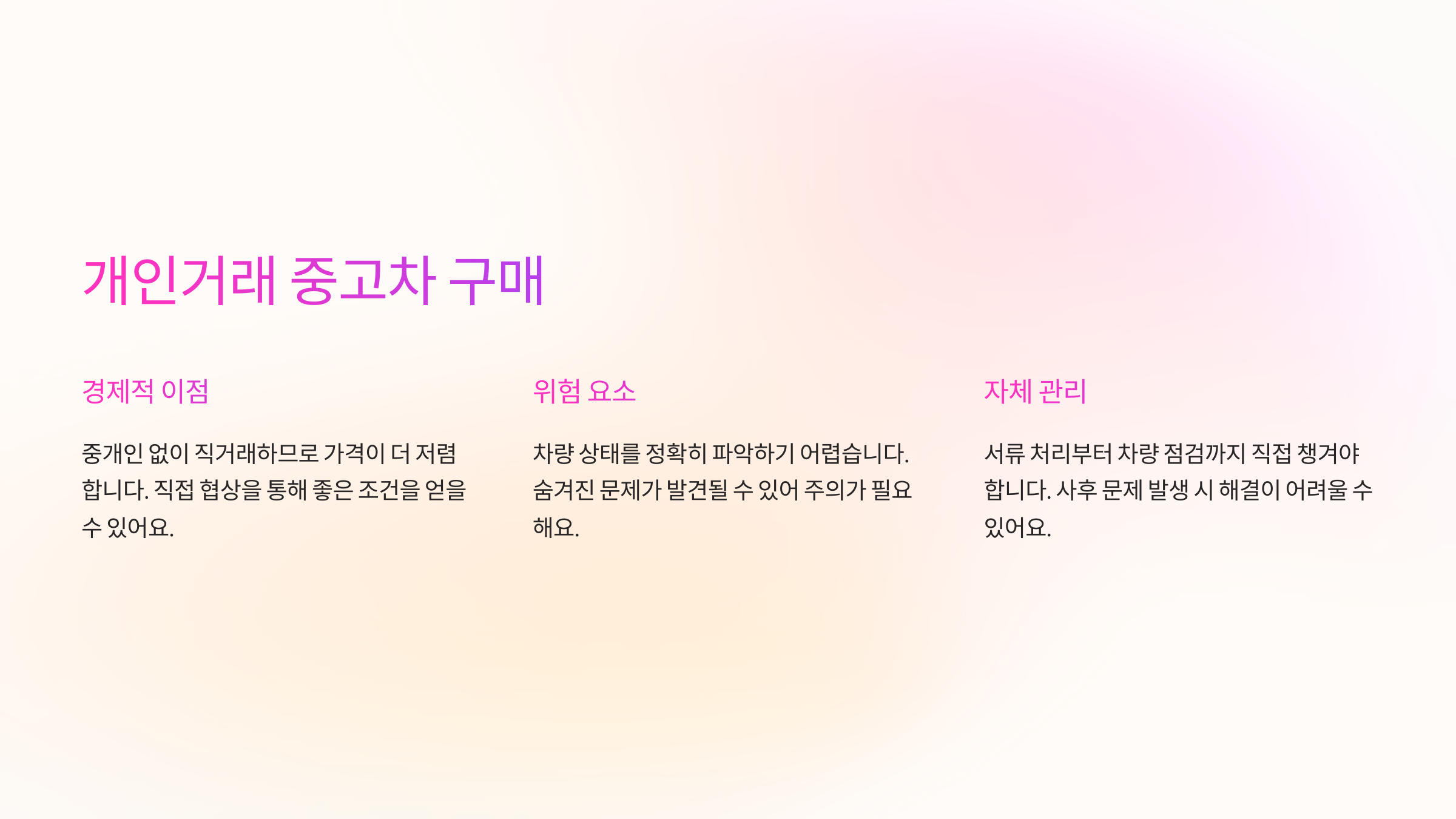 | 개인거래 | 차량 소유자와 직접 거래 | 가격이 저렴함, 협상 가능 | 사기 위험, 보증 없음 |