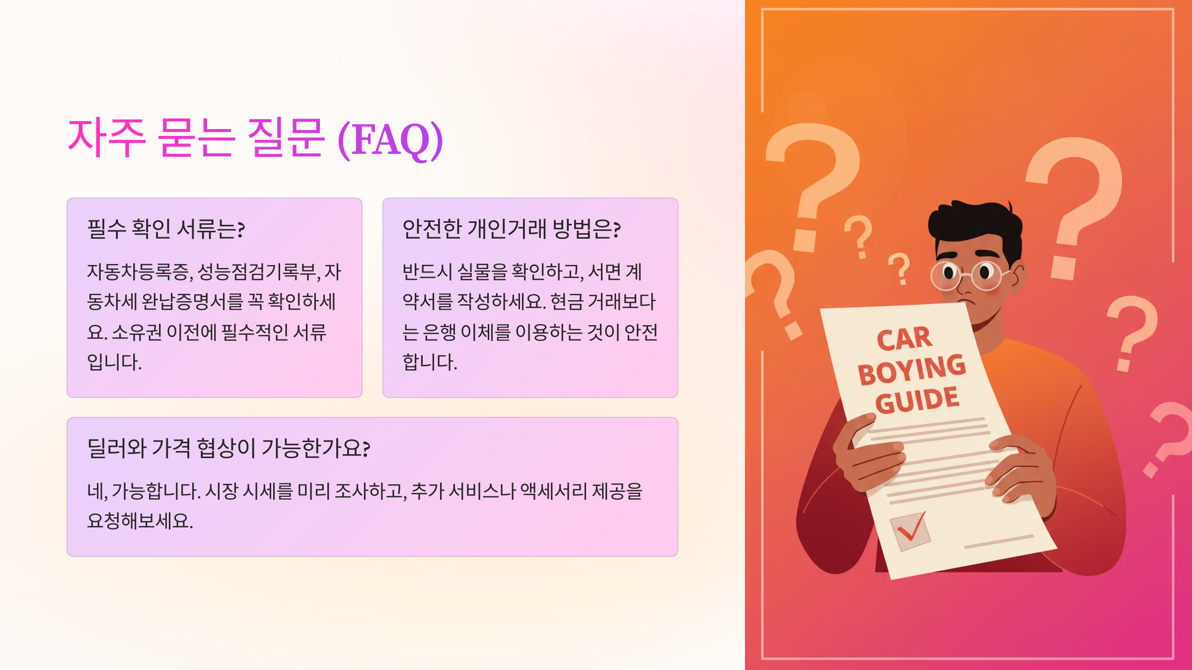 🚗 TIP: "초보자라면 딜러 거래가 더 안전하고 편리하고, 비용을 최대한 절감하고 싶다면 개인거래가 유리할 수 있어요." 하지만 개인거래 시 사기 예방을 위해 철저한 점검이 필수예요! 🔍