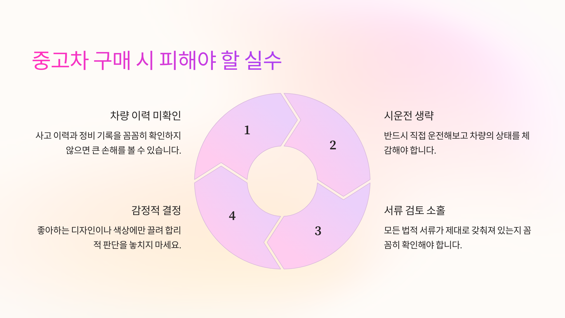 아래 "중고차 구매 시 흔히 하는 실수 5가지"를 확인하고, 후회 없는 구매를 해보세요! ✅