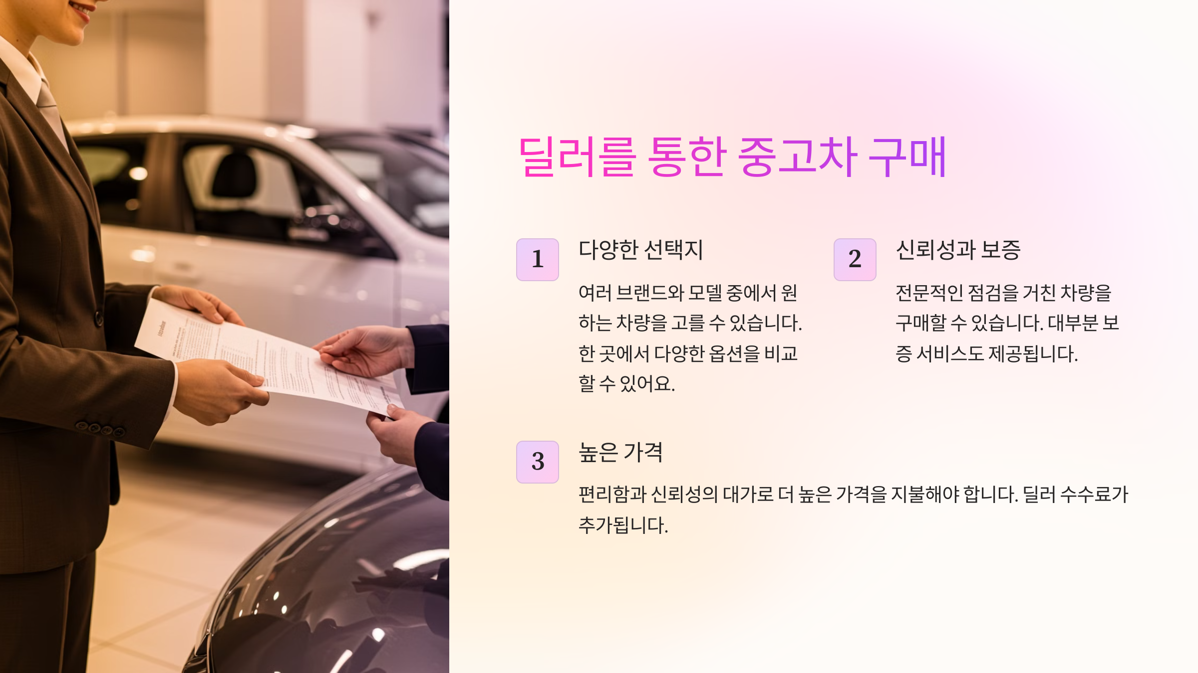 🏢 딜러를 통한 중고차 구매, 장점과 단점