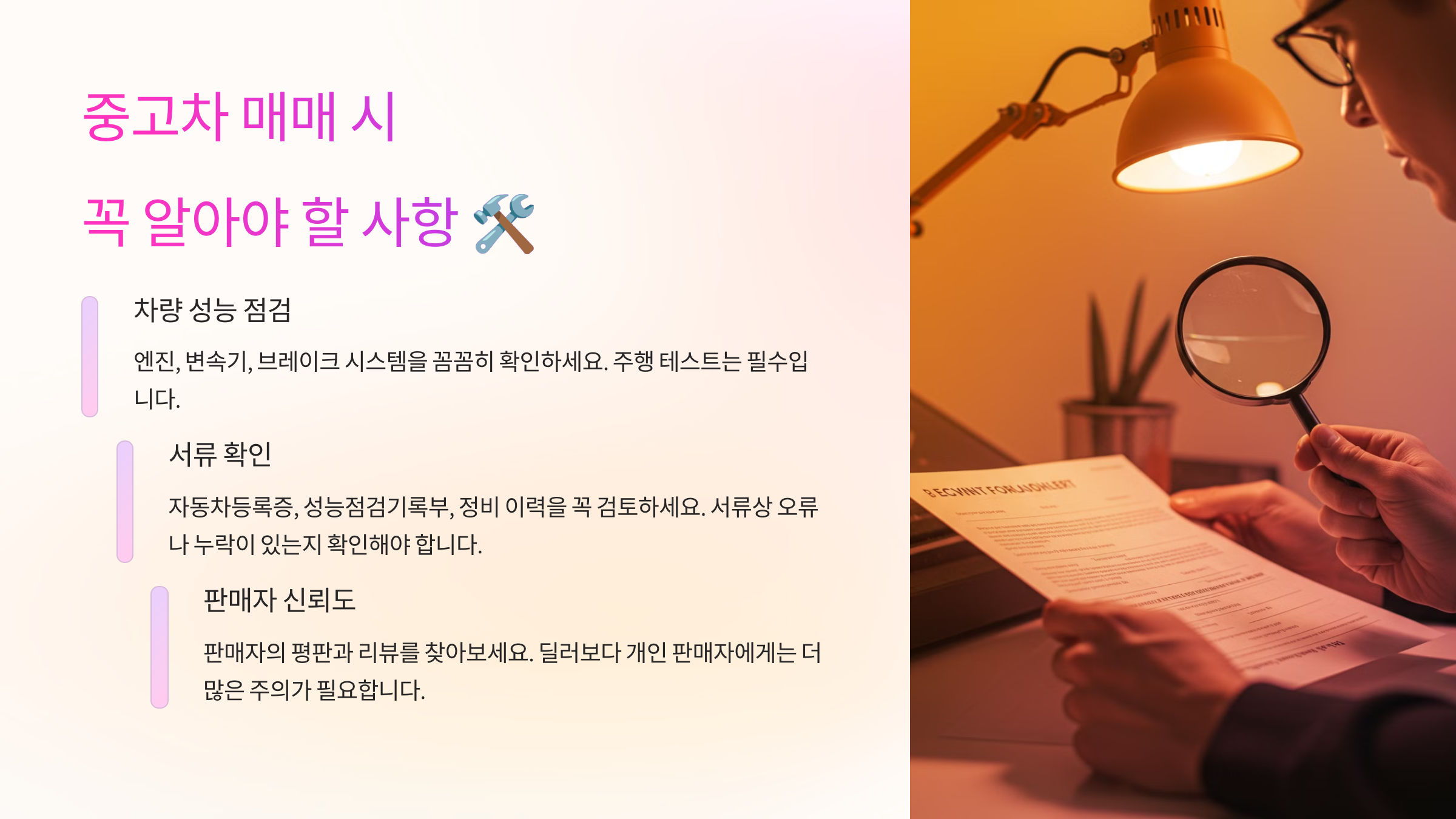 이제 중고차를 살 때 꼭 알아야 할 필수 사항을 살펴볼까요? 🛠