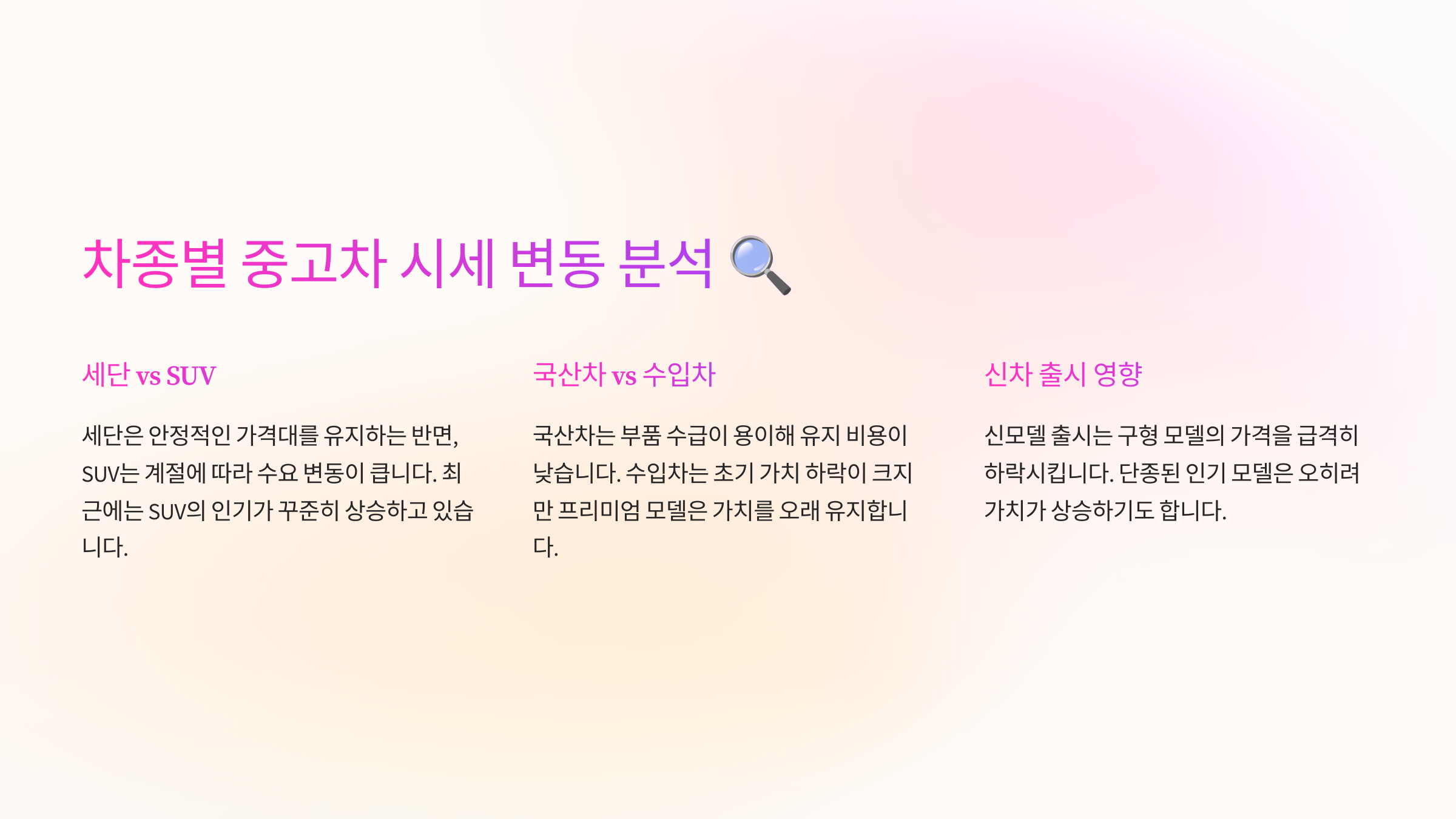 🚗 중고차 시세는 차종마다 다르게 변동해요. 인기 모델은 가격이 안정적인 반면, 판매량이 적은 차는 감가상각이 빠르게 진행되죠.