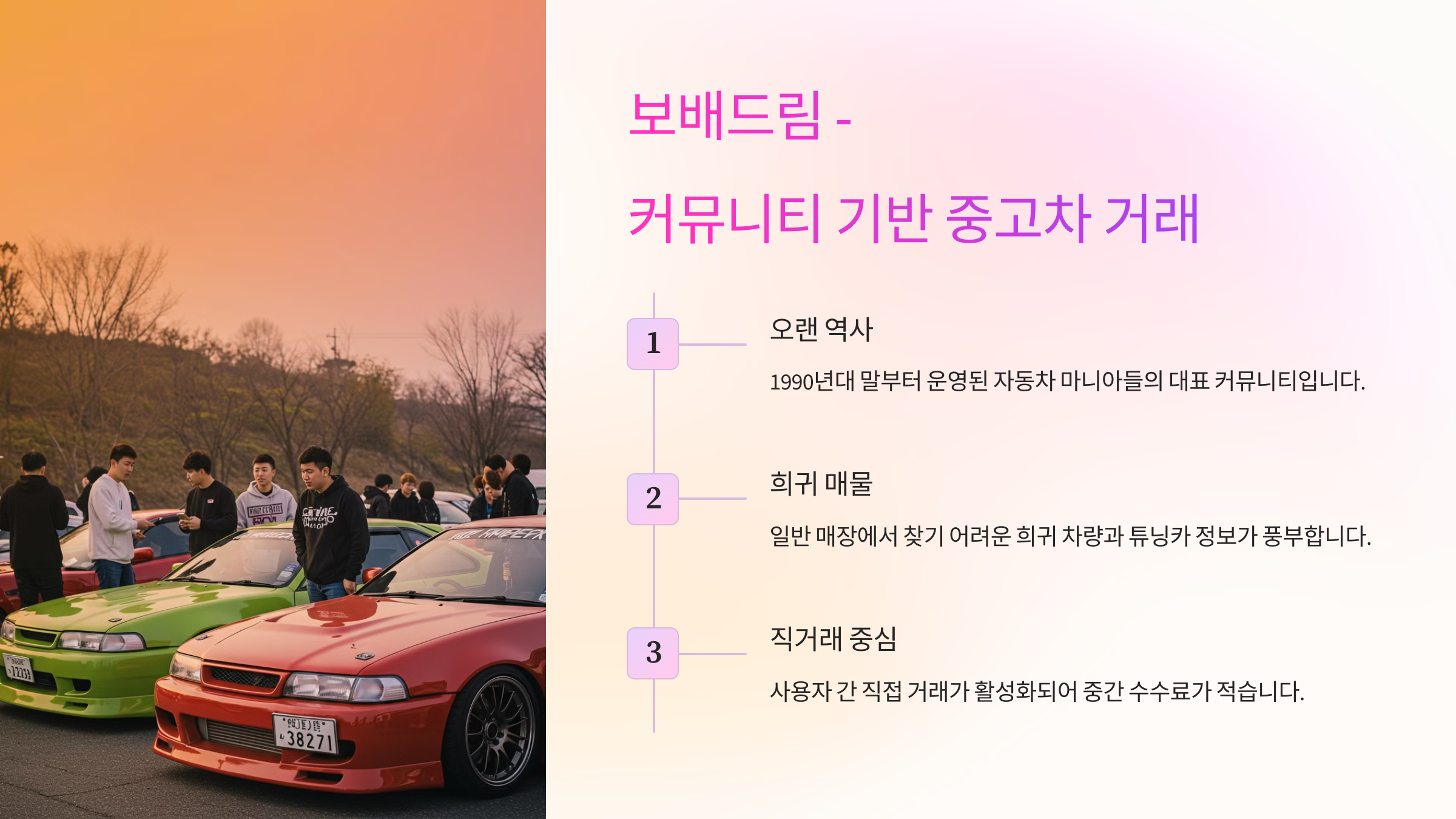 보배드림은 대한민국에서 가장 활성화된 자동차 커뮤니티이면서, 동시에 중고차 직거래 플랫폼으로도 유명해요. 🚗