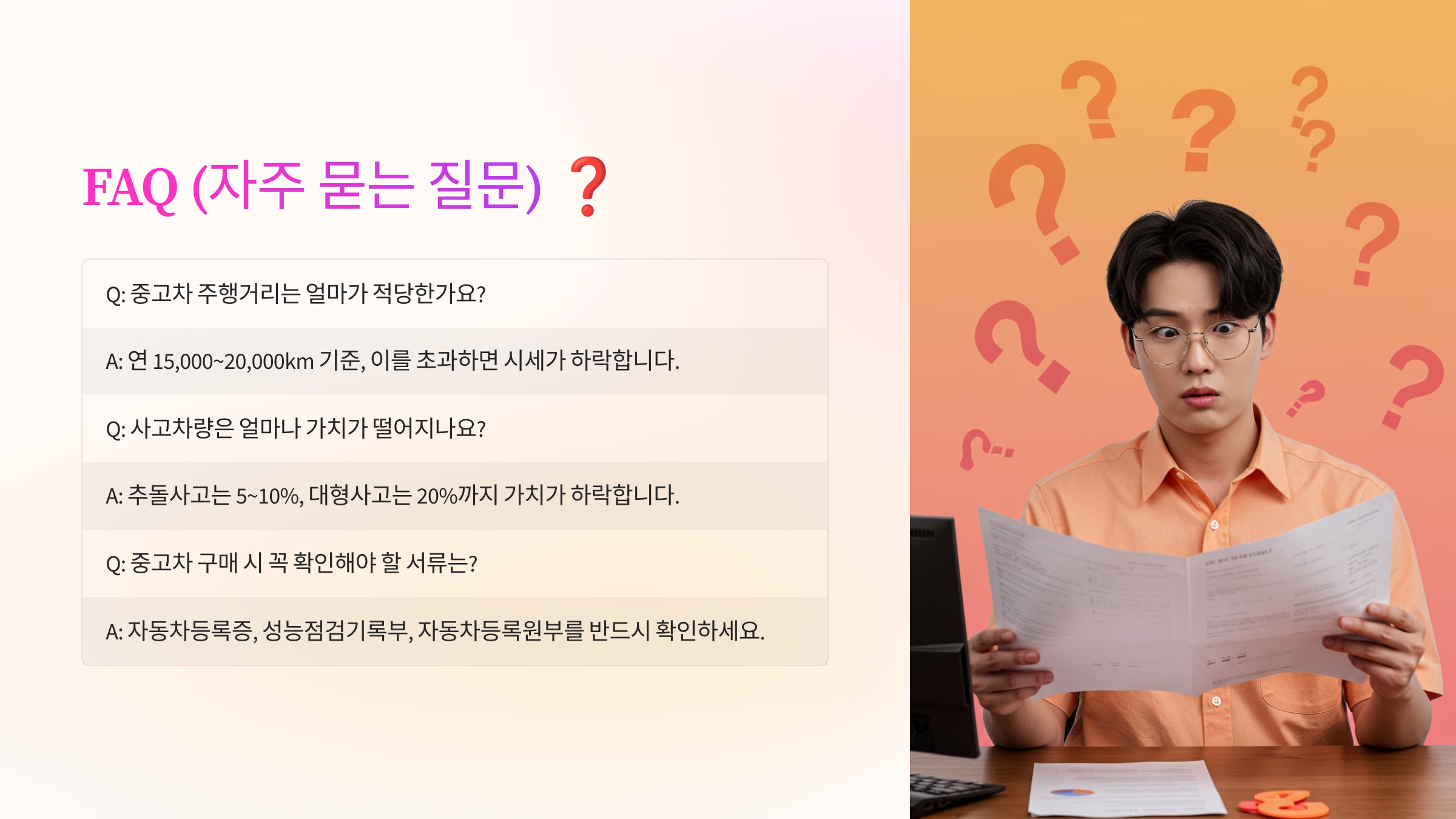 중고차를 구매한 후에는 최소 1~2주 동안 주행 테스트를 해보는 것이 좋아요! 🚗 혹시라도 이상한 소음이 들리거나, 주행 중 문제가 발생한다면 바로 점검받아야 해요. 이제 마지막으로, 자주 묻는 질문(FAQ)을 확인해볼까요? 😊