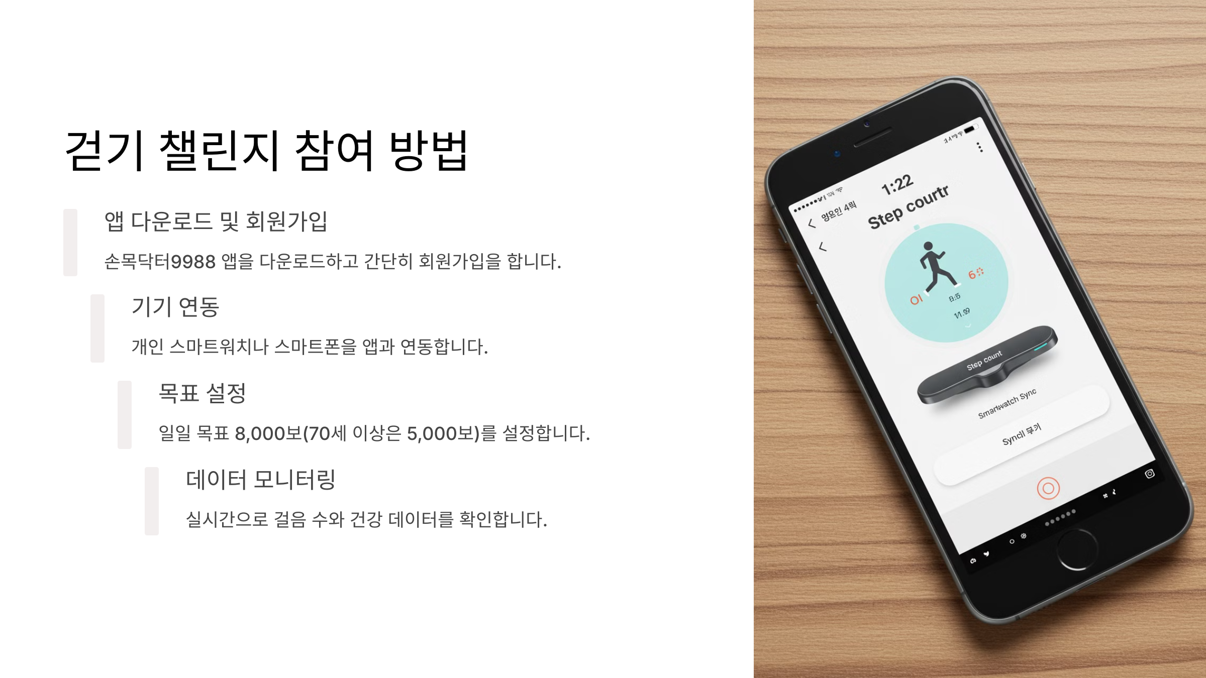 - 📱 걷기 게임 또는 챌린지 활용: 손목닥터9988의 걸음 수 챌린지에 참여해 목표 달성의 재미를 더해 보세요!