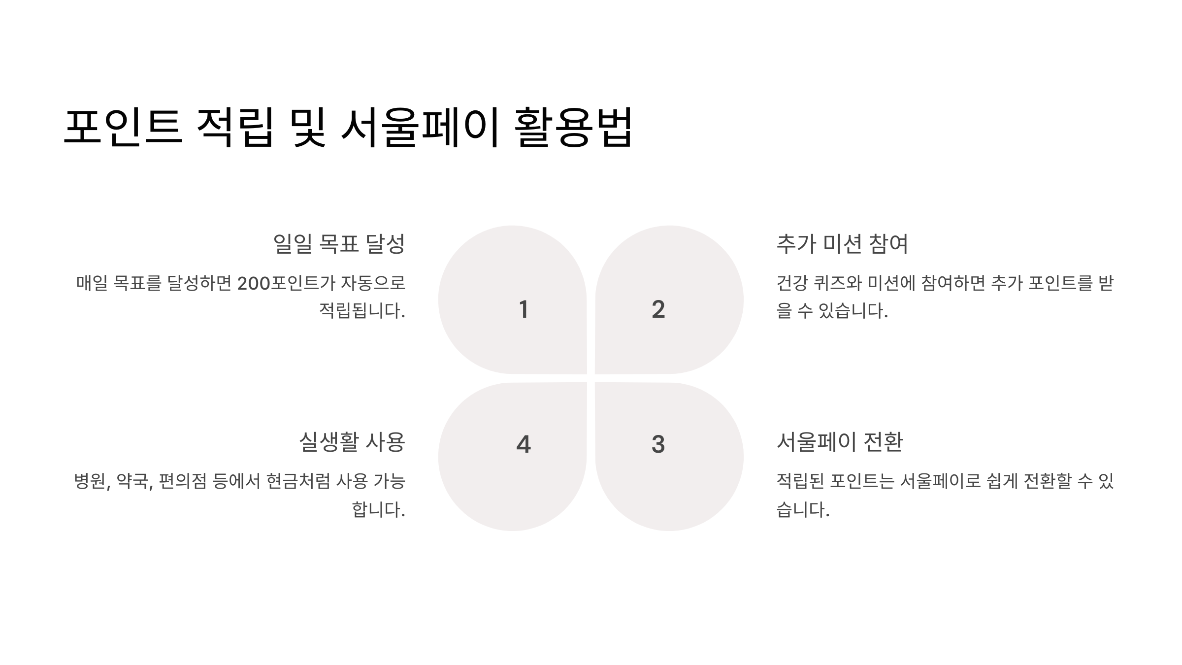 ✅ 하루 8,000보 걷기 목표 달성으로 건강 개선 ✅ 포인트 적립 후 서울페이 전환 가능 → 실생활에서 사용 가능 ✅ AI 건강 코칭 기능으로 맞춤형 운동 및 식단 관리 가능