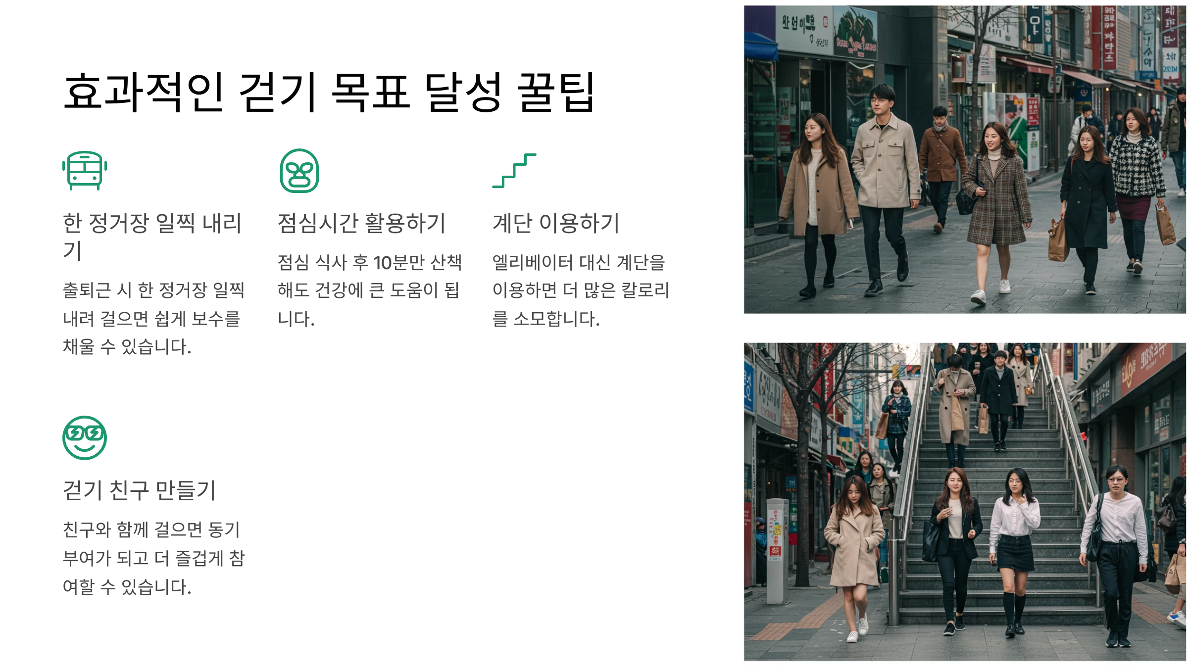 아래 걷기 실천 꿀팁을 활용하면 무리 없이 목표를 달성할 수 있을 거예요! 🎯