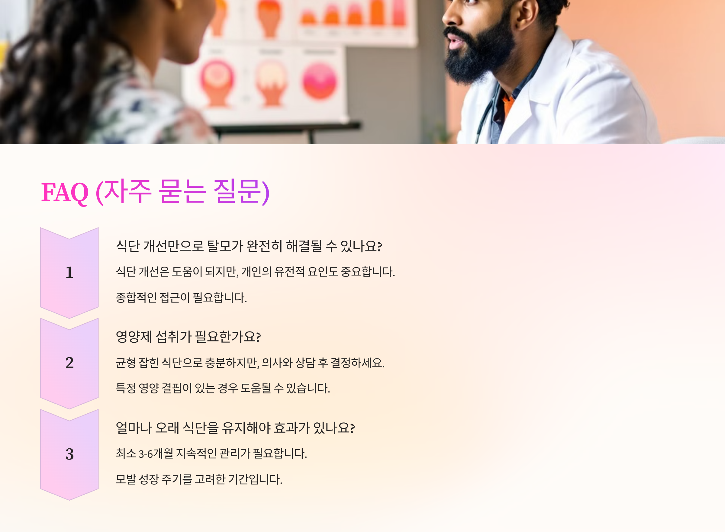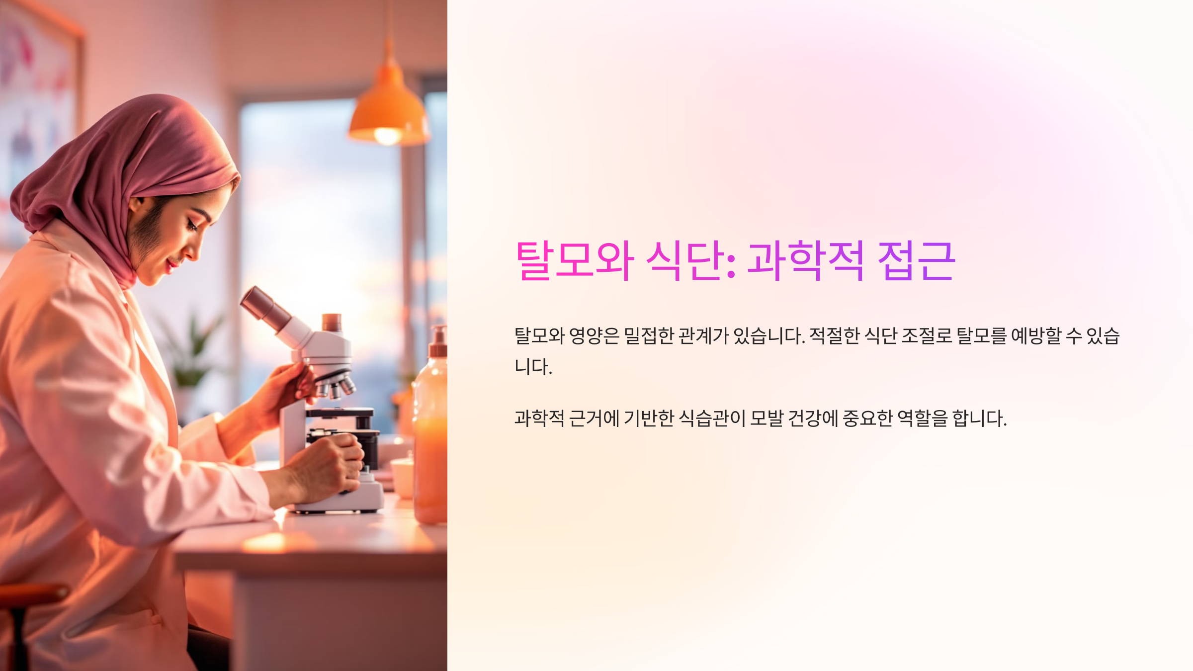 이런 영양 균형은 단기간보다는 꾸준한 식습관으로 쌓이기 때문에, 오늘부터 식단을 조금씩 바꿔보는 게 가장 좋은 탈모 관리의 시작이에요.