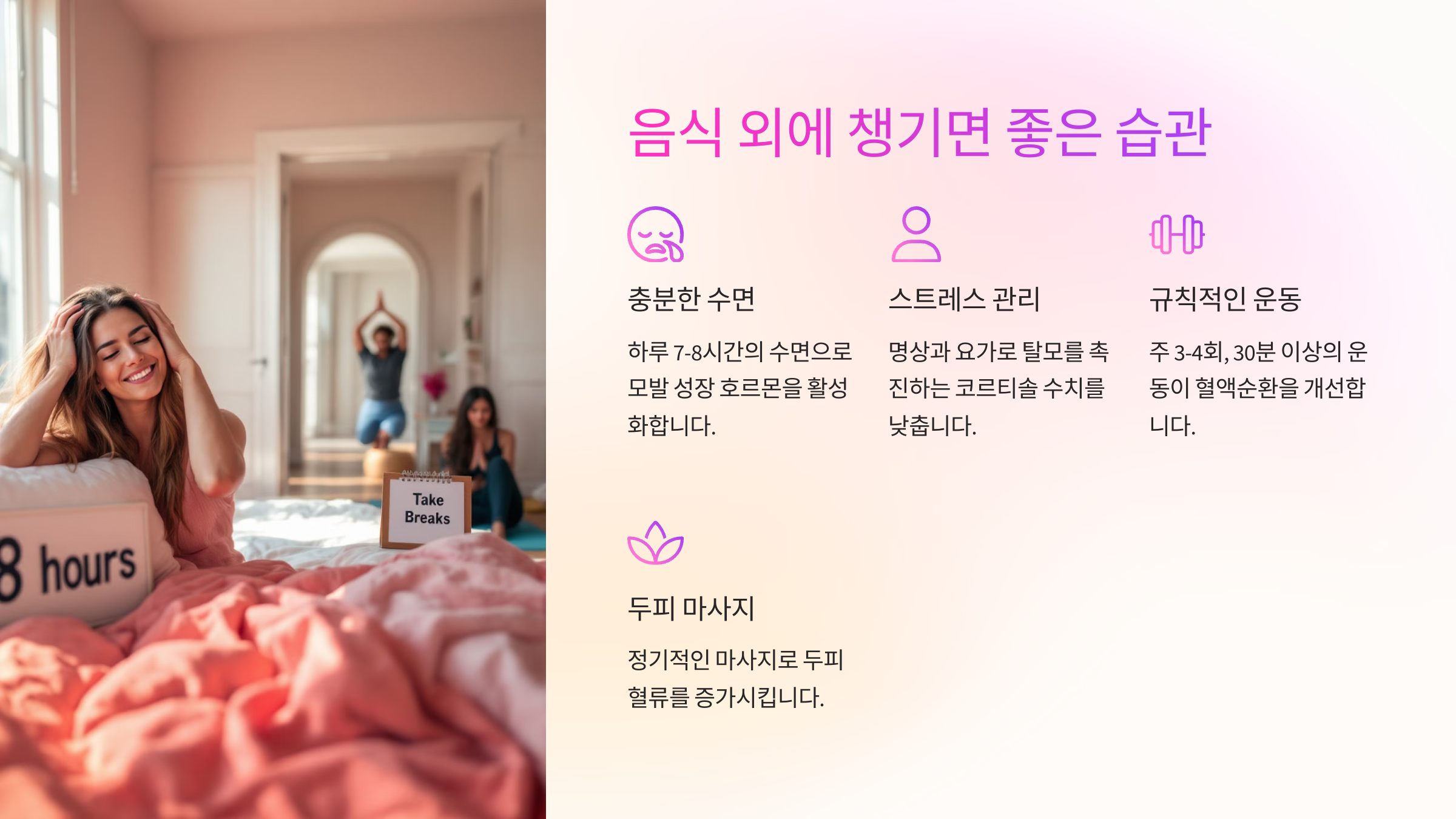 - 💤 충분한 수면: 모발 성장 호르몬은 밤에 분비돼요.
