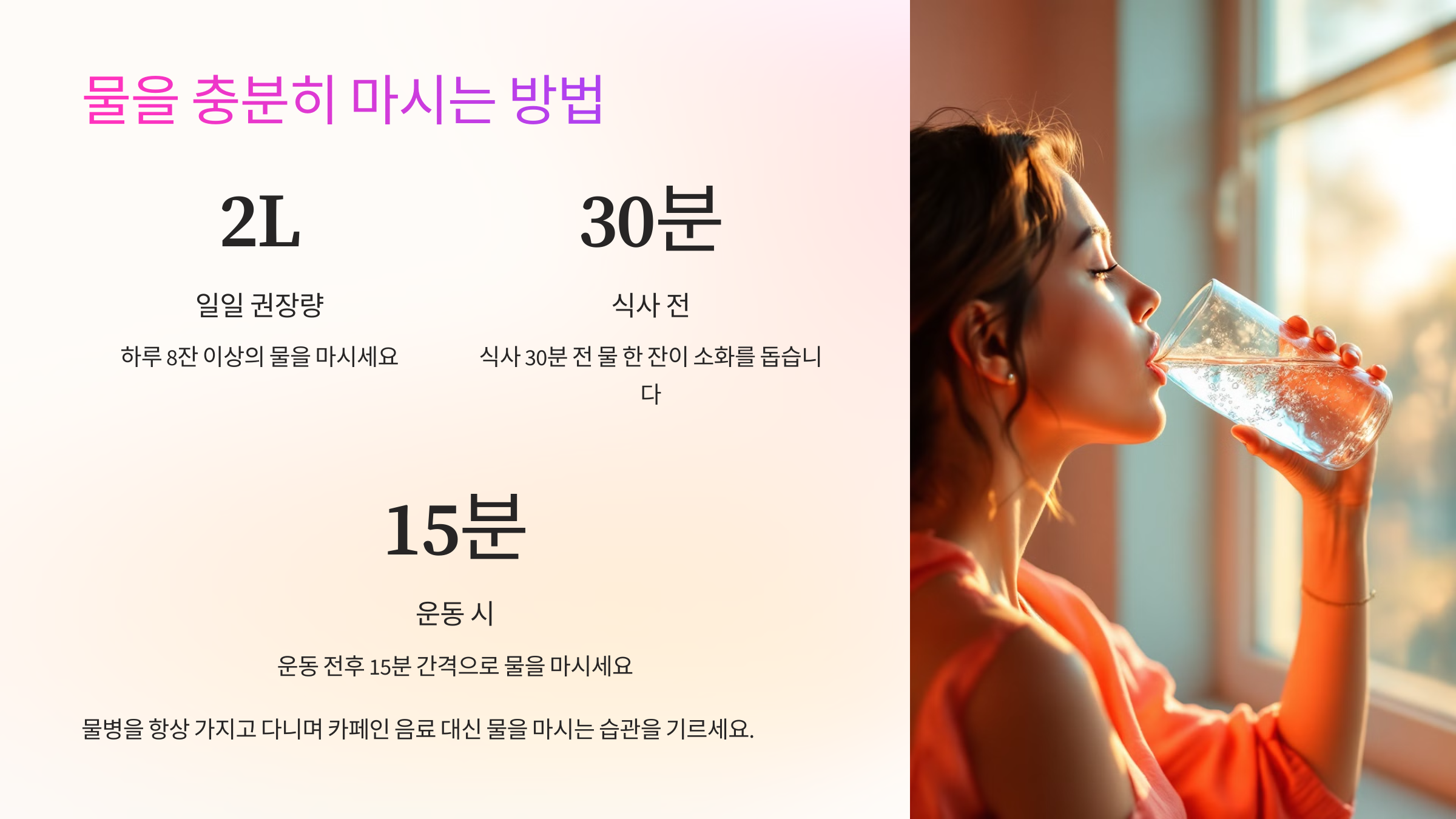 | 아침 기상 직후 | 300~500ml | 너무 차가운 물은 피하기 |