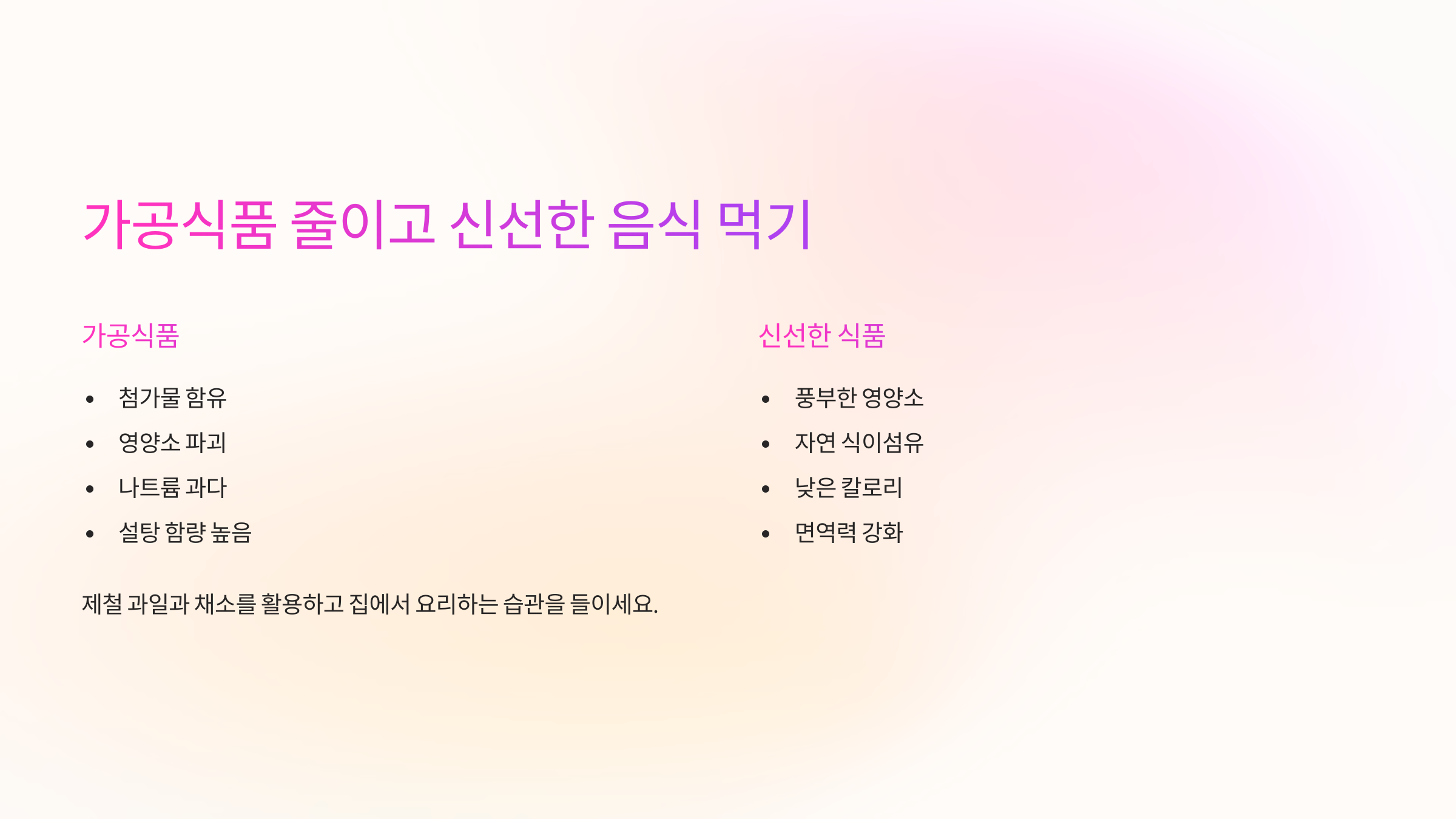 가공식품은 편리하지만 건강을 생각한다면 신선한 음식을 선택하는 것이 좋아요. 매일 조금씩 자연식품을 늘려보세요! 🥦